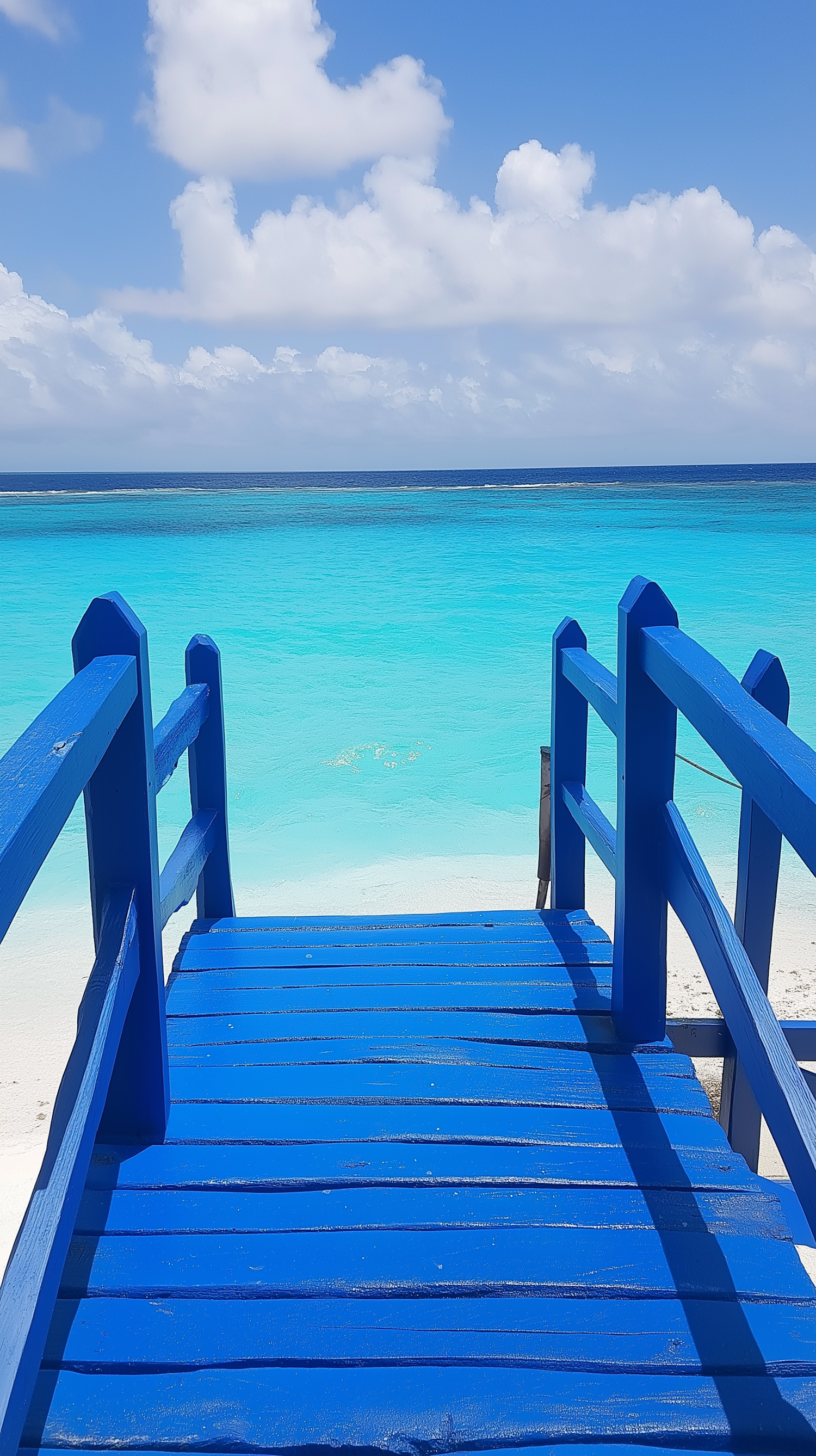 Vibrant blue walkway leading to a stunning turquoise ocean under a clear sky with fluffy clouds. Serene and inviting beach scene.