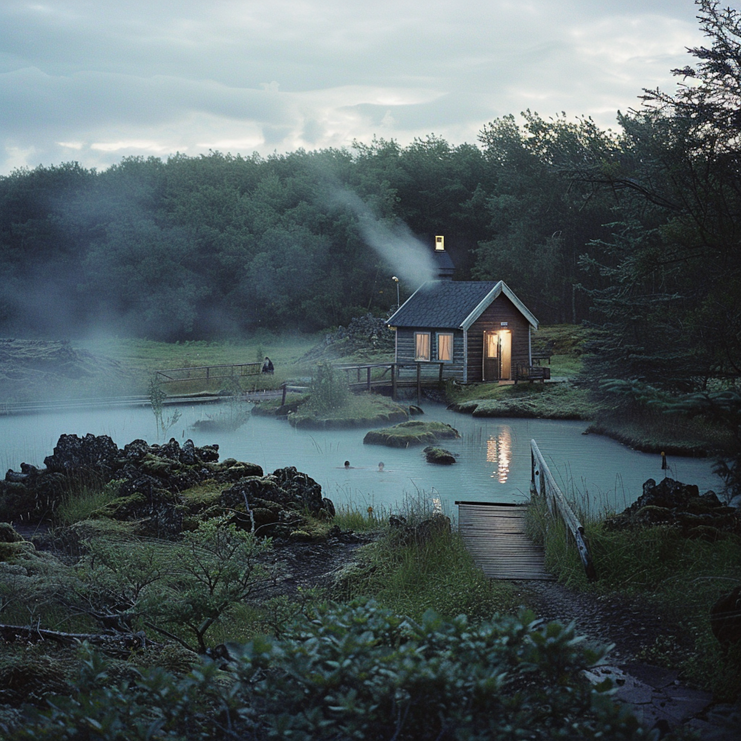 Cozy cabin by a misty lake with a wooden bridge, surrounded by lush greenery and rocky formations, exuding tranquility and warmth.
