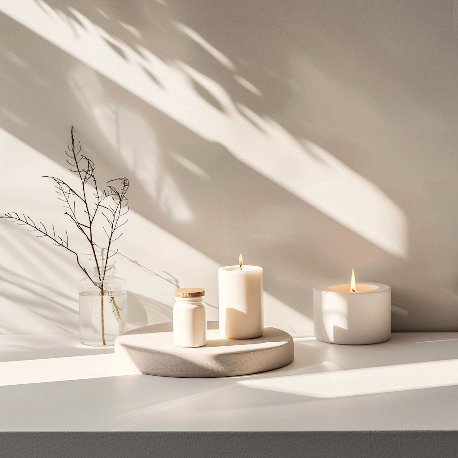 Minimalist scene with lit candle, dried branch in vase, and soft shadows on a white surface. Calm and soothing ambiance.