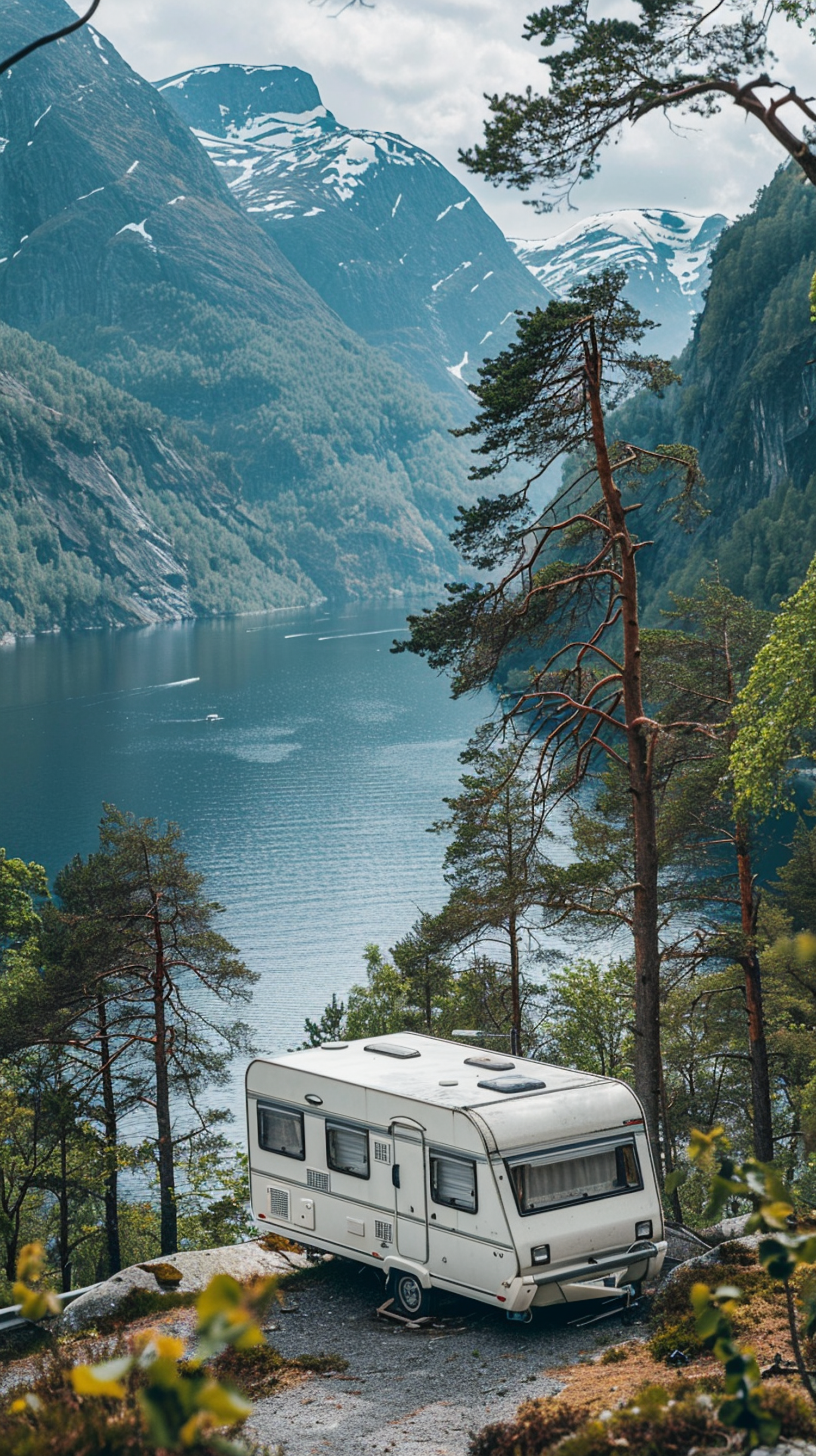 White caravan parked by a scenic lake with snow-capped mountains and lush trees, perfect for a tranquil nature retreat.