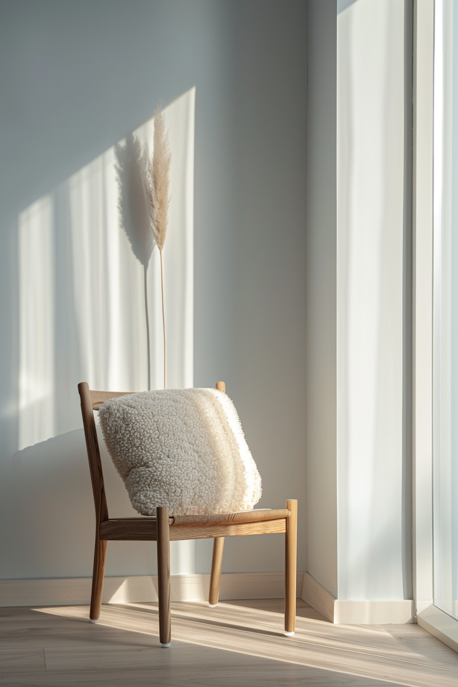 Minimalist wooden chair with a fluffy cushion in a sunlit corner, featuring pampas grass and soft shadows for a serene ambiance.
