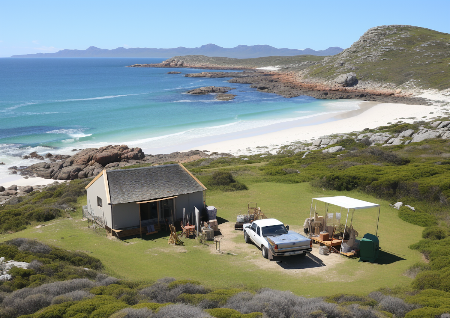 Coastal cabin with a workshop setup, white pickup truck, and stunning beach view. Ideal for a serene retreat or creative workspace.