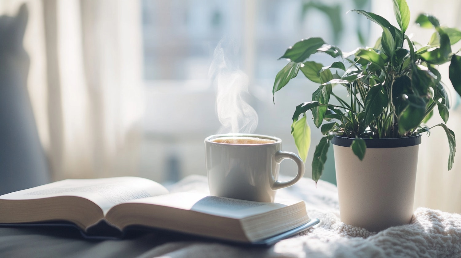 Cozy scene with a steaming coffee cup, open book, and lush plant, bathed in soft natural light for a serene atmosphere.