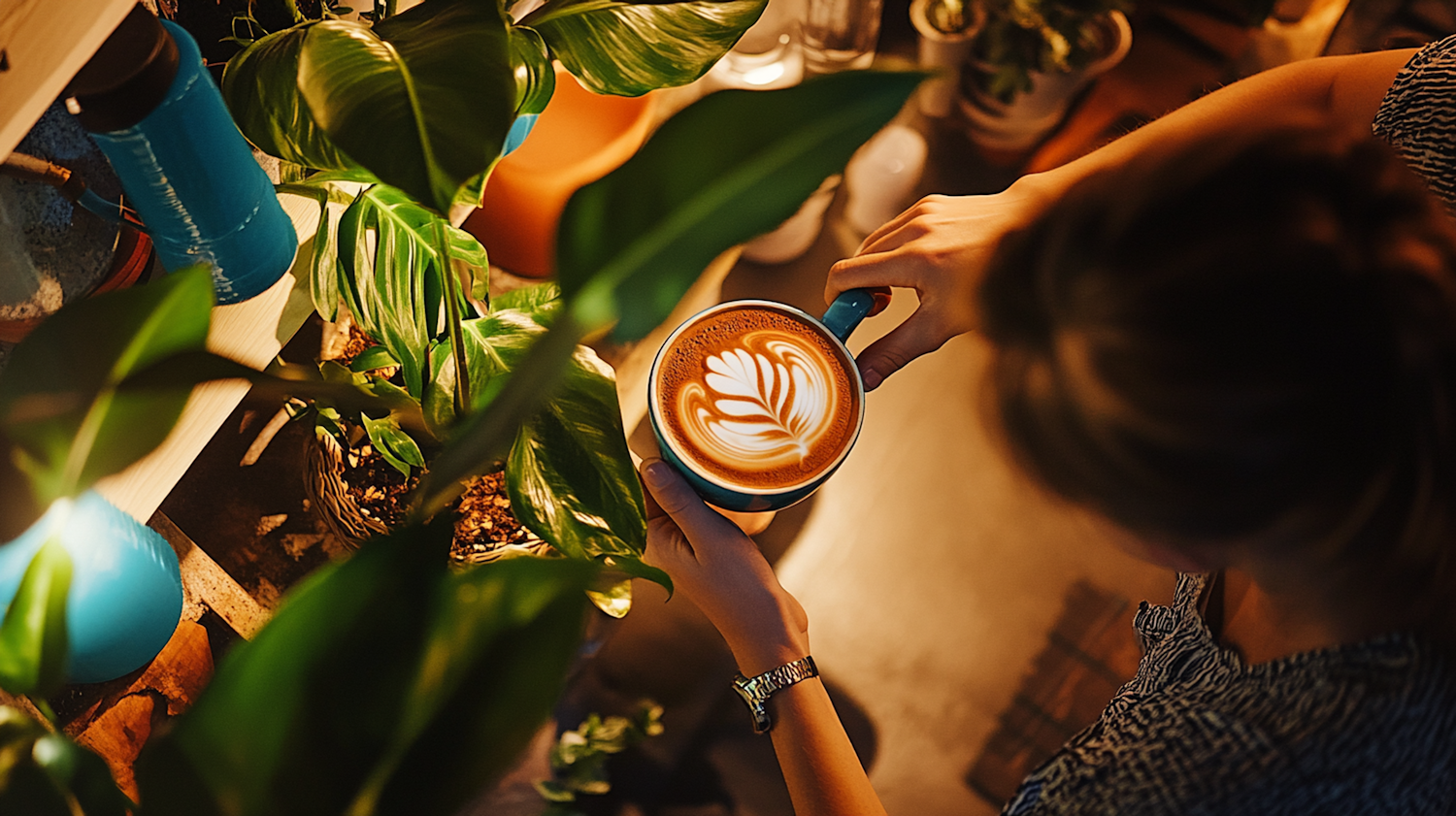 Warmly lit scene of a person holding a latte with leaf art, surrounded by lush green plants, creating a cozy and serene atmosphere.