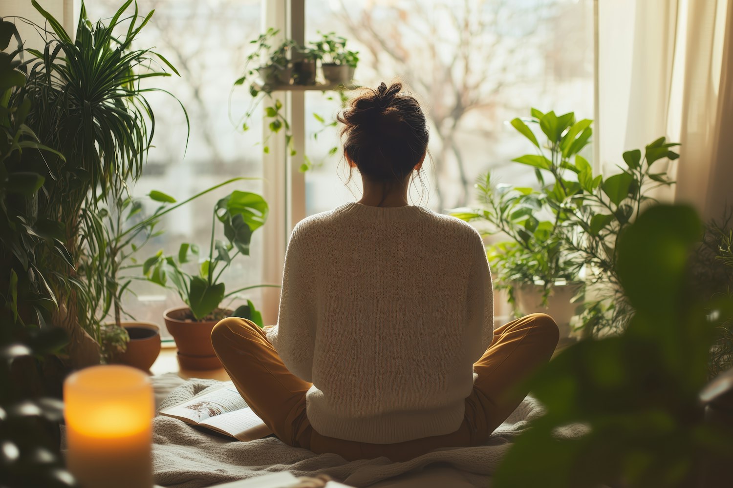 Woman in cozy room surrounded by plants, sitting cross-legged with a candle, creating a serene and peaceful atmosphere.