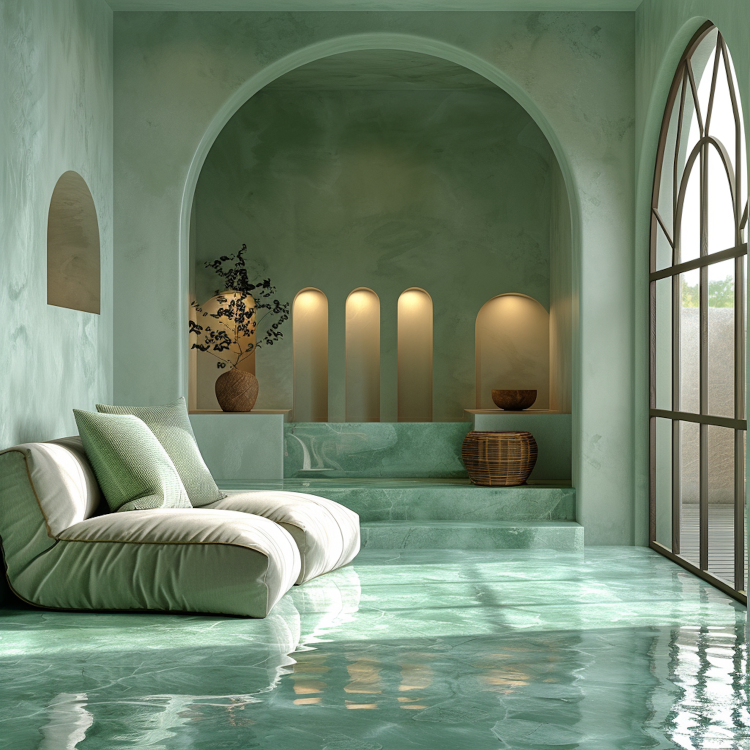Elegant green-themed interior with plush sofa, marble floor, and arched window. Soft lighting and natural elements create a serene ambiance.