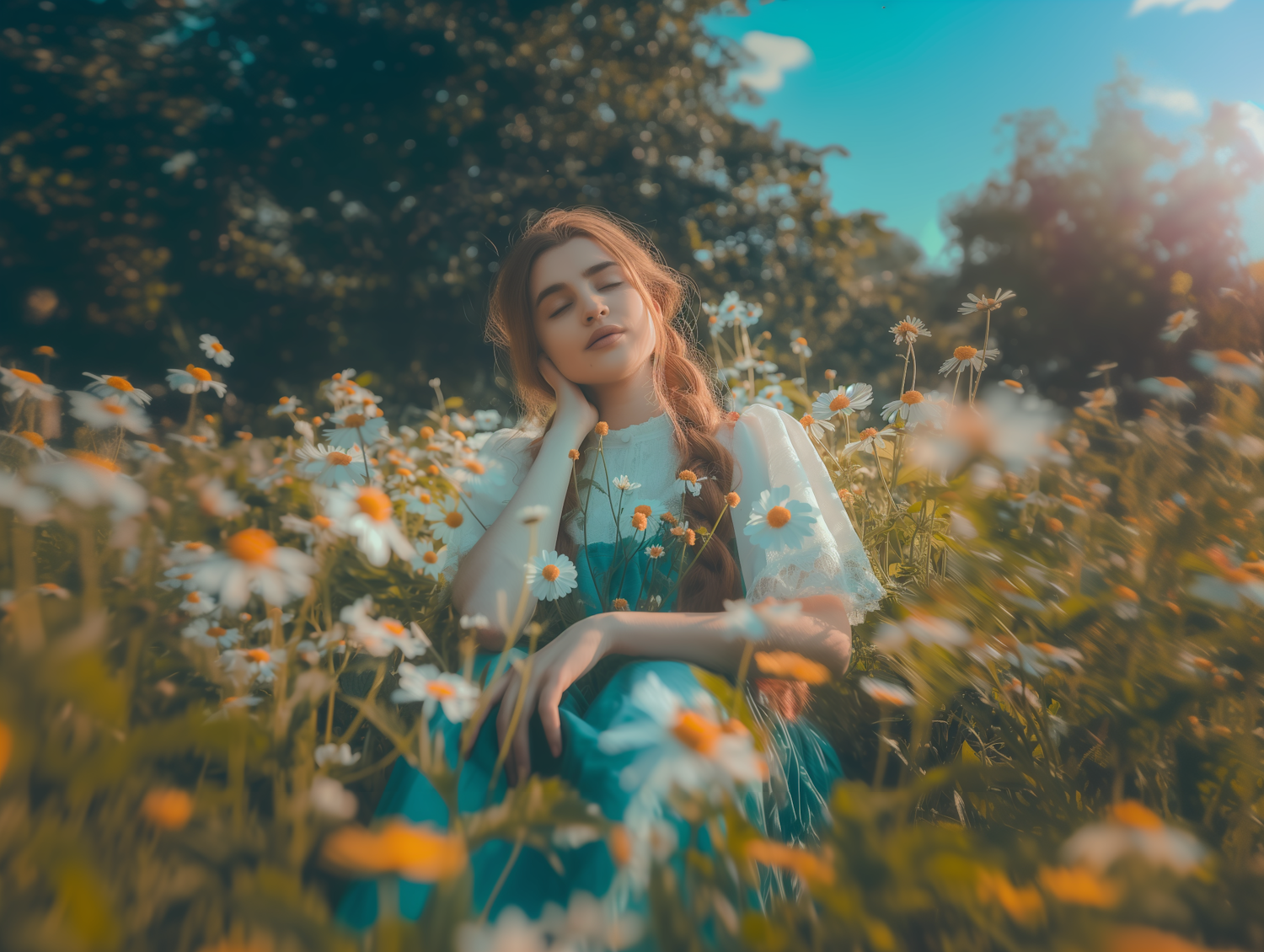 A serene woman in a field of daisies, eyes closed, enjoying nature's tranquility under a warm, golden sunlight.
