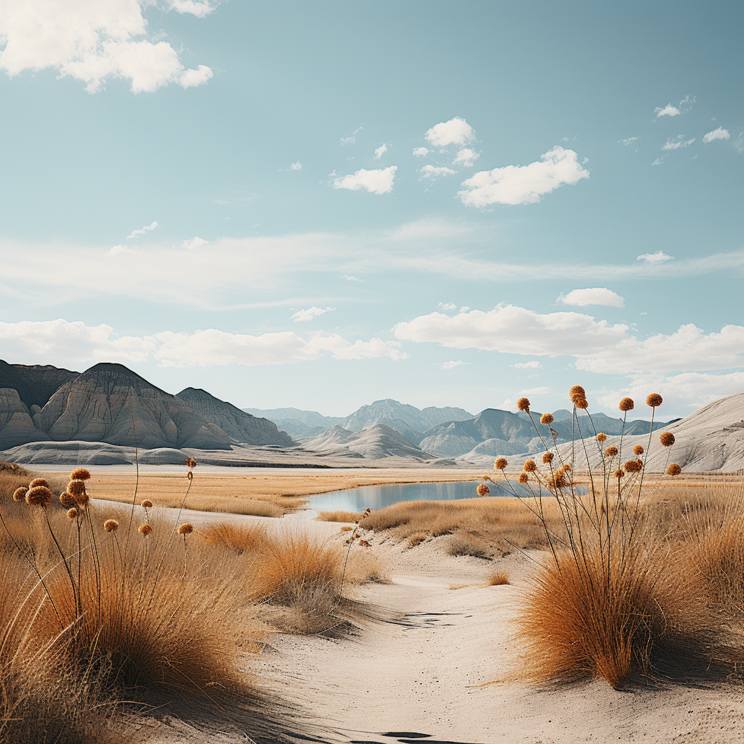 Serene desert landscape with golden grasses, a tranquil lake, and distant mountains under a clear blue sky.