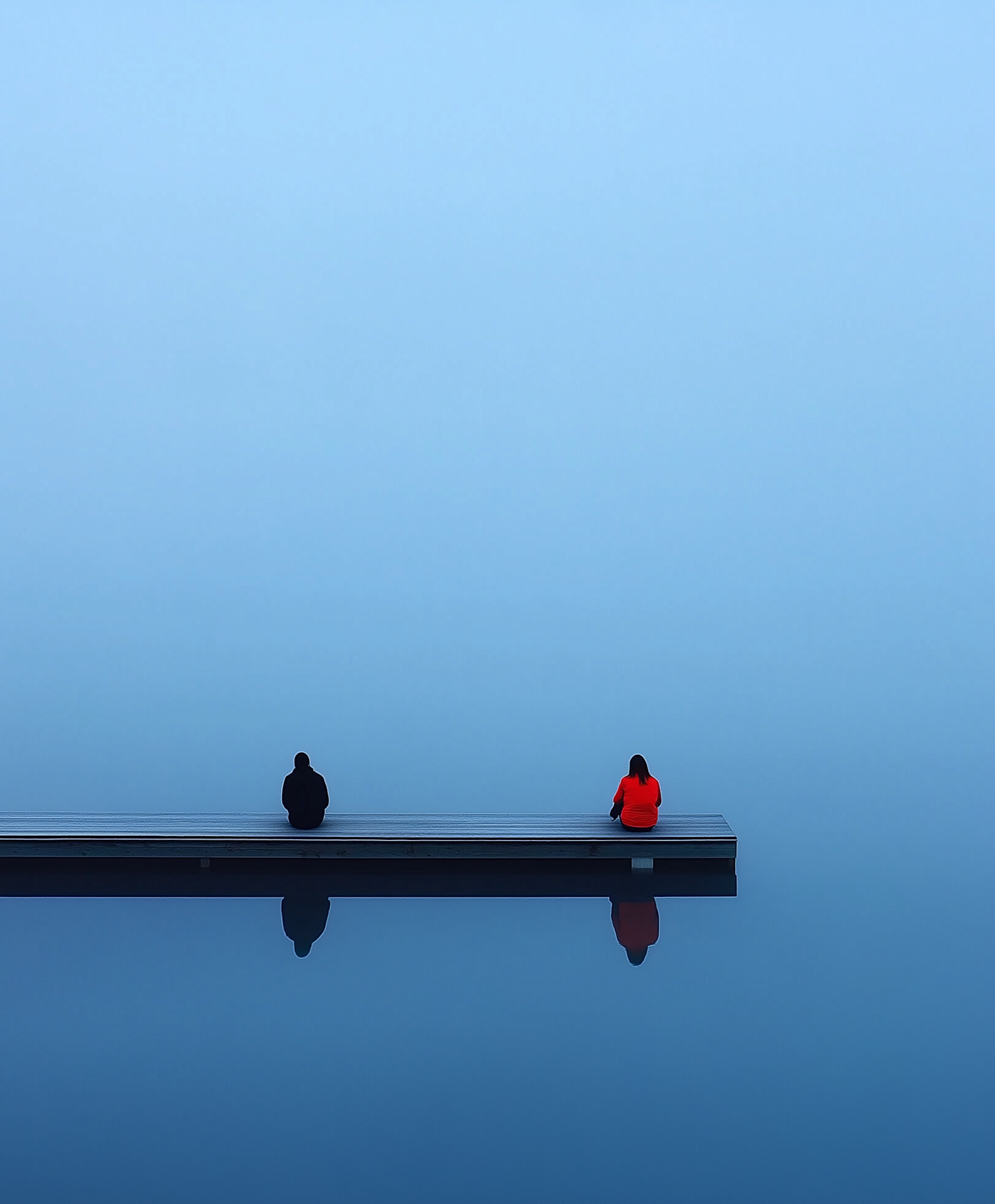 Two people sit on a dock over calm water, one in black, one in red, against a misty blue backdrop, creating a serene and reflective scene.