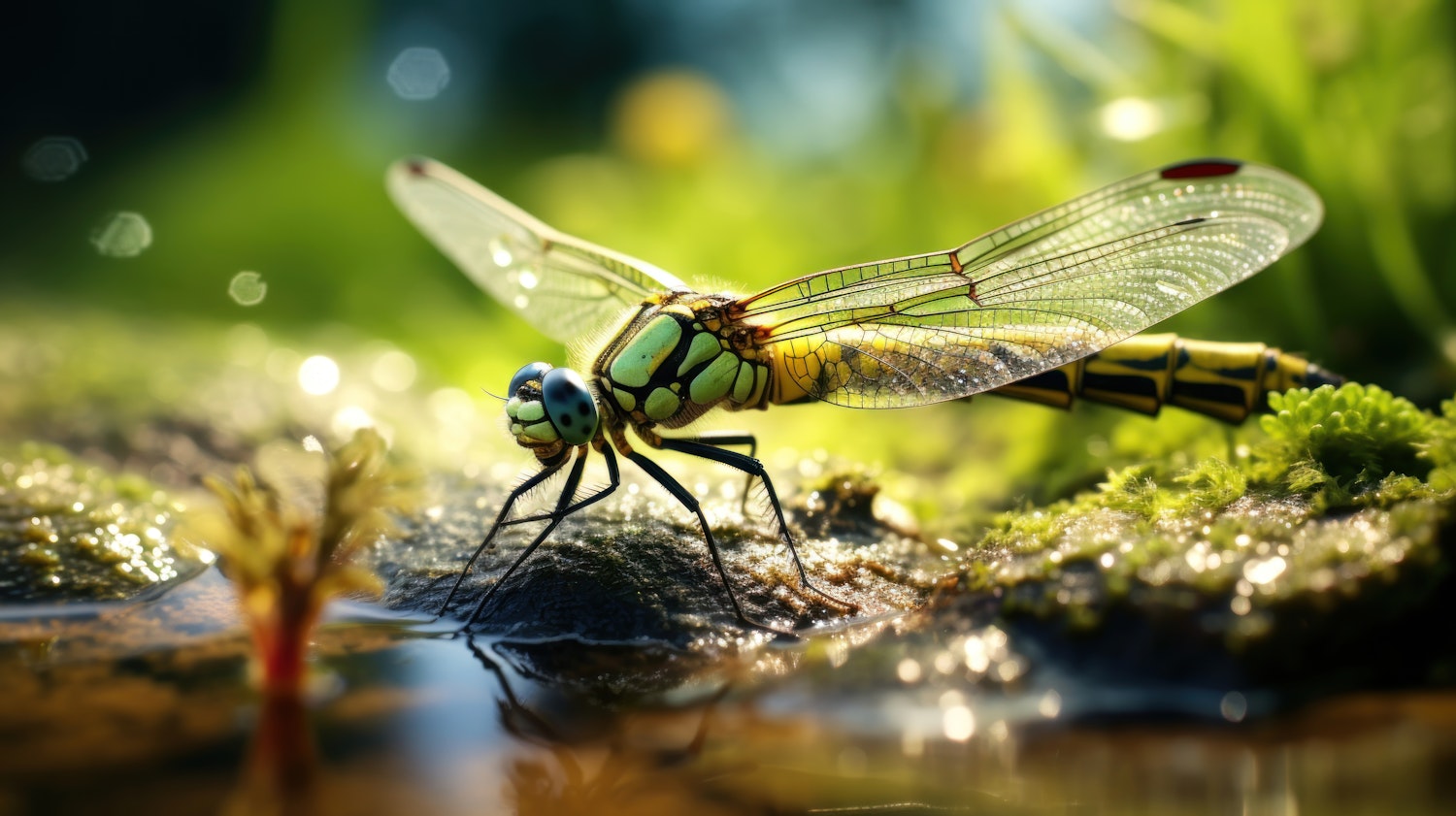 Close-up of a vibrant dragonfly on moss, with shimmering wings and intricate patterns, set against a lush, sunlit background.