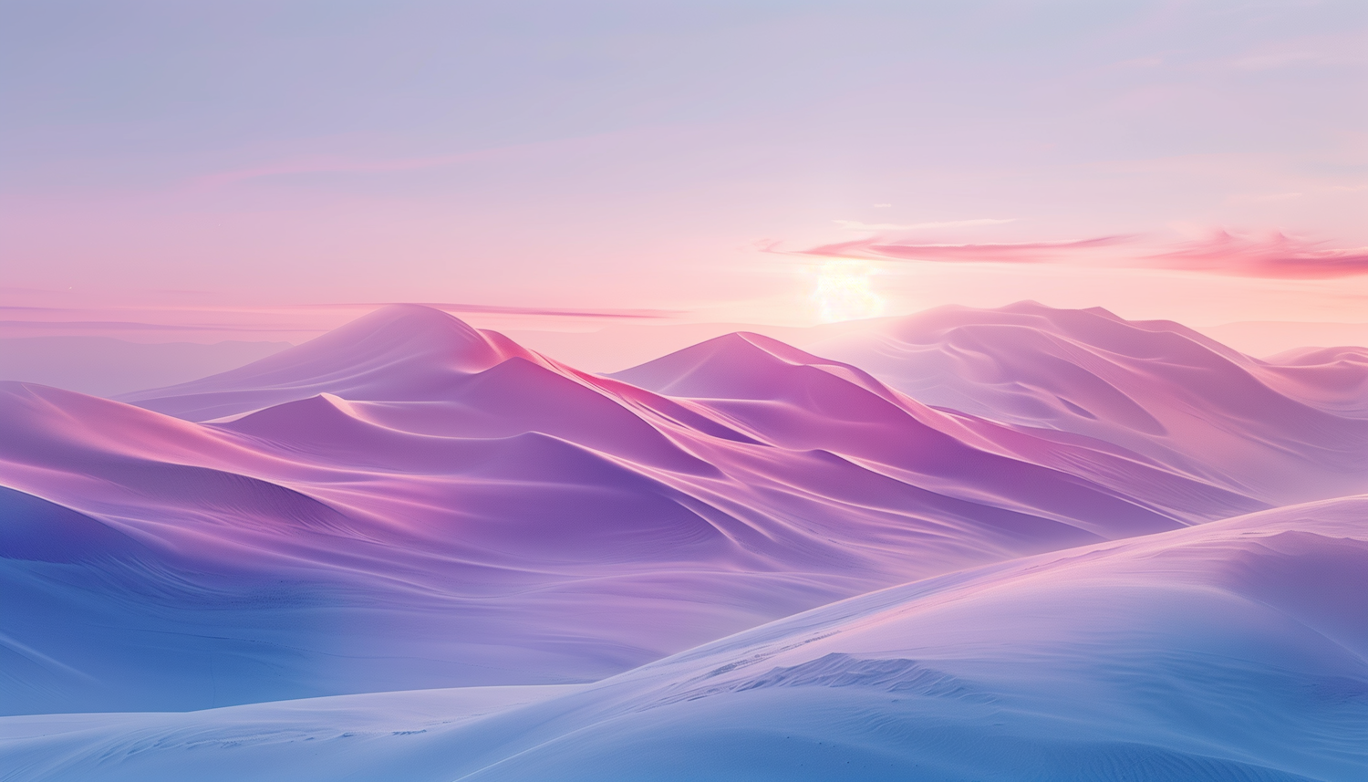 Surreal pastel sand dunes with a pink and purple sky, creating a dreamlike and tranquil landscape.