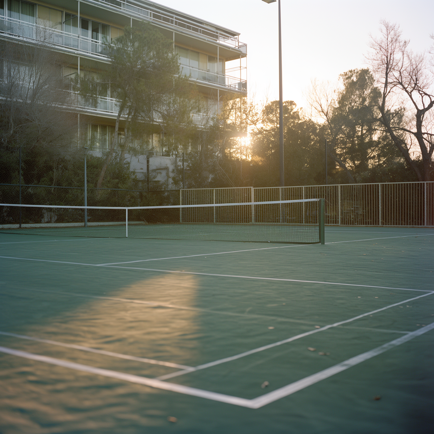 Sunlit tennis court with green surface and white lines, set against a backdrop of trees and a multi-story building.