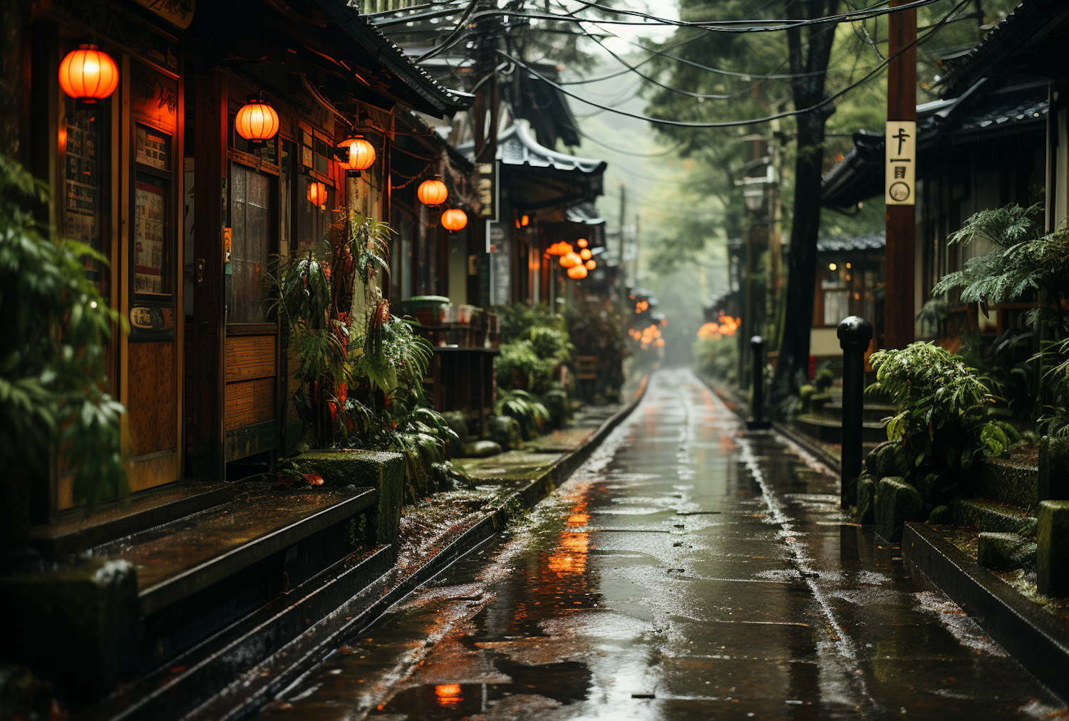 Rain-soaked Japanese street with glowing red lanterns and lush greenery, creating a serene and atmospheric scene.