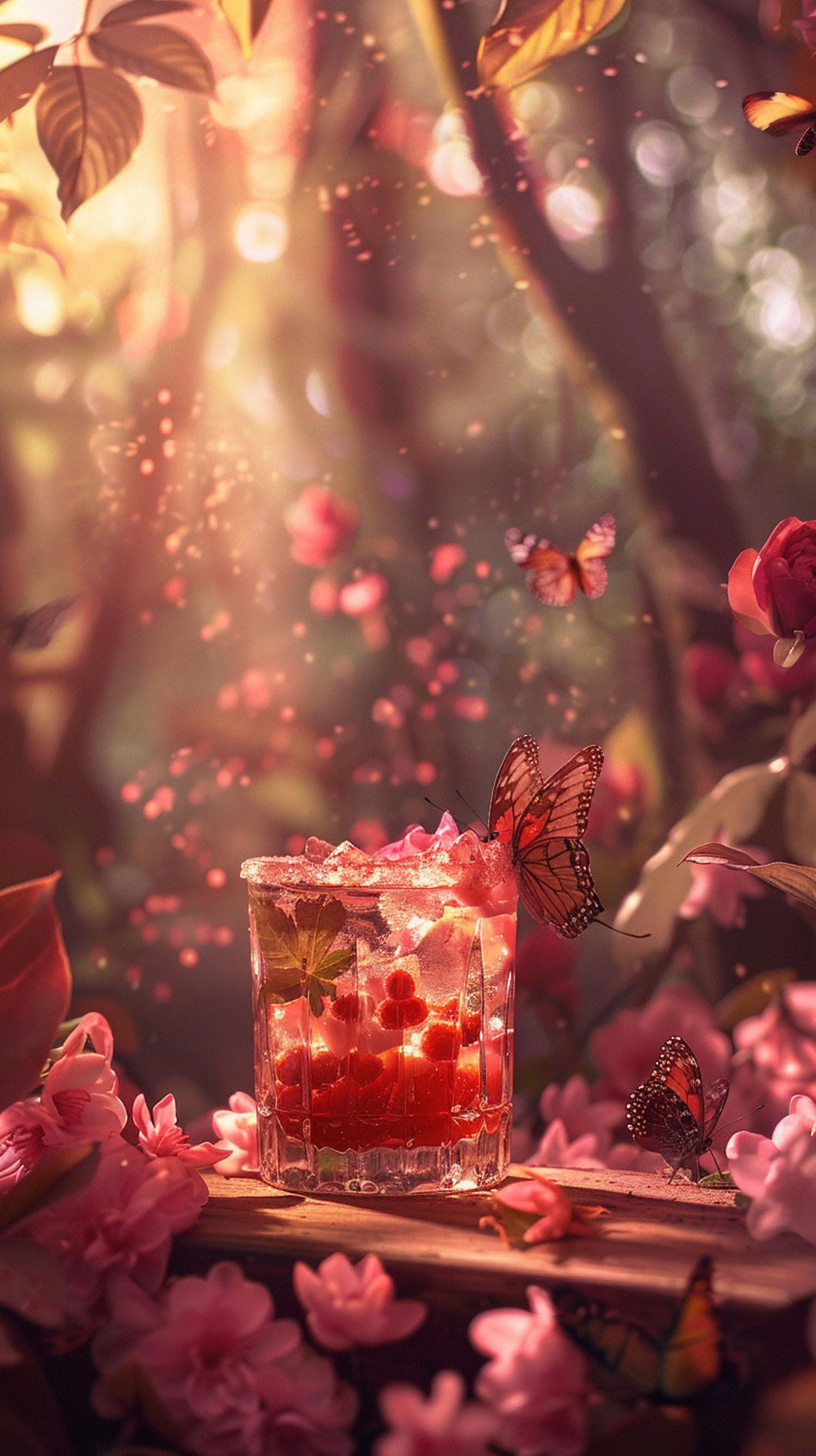 Enchanting scene with a sparkling red drink, butterflies, and pink flowers in a dreamy, sunlit setting.
