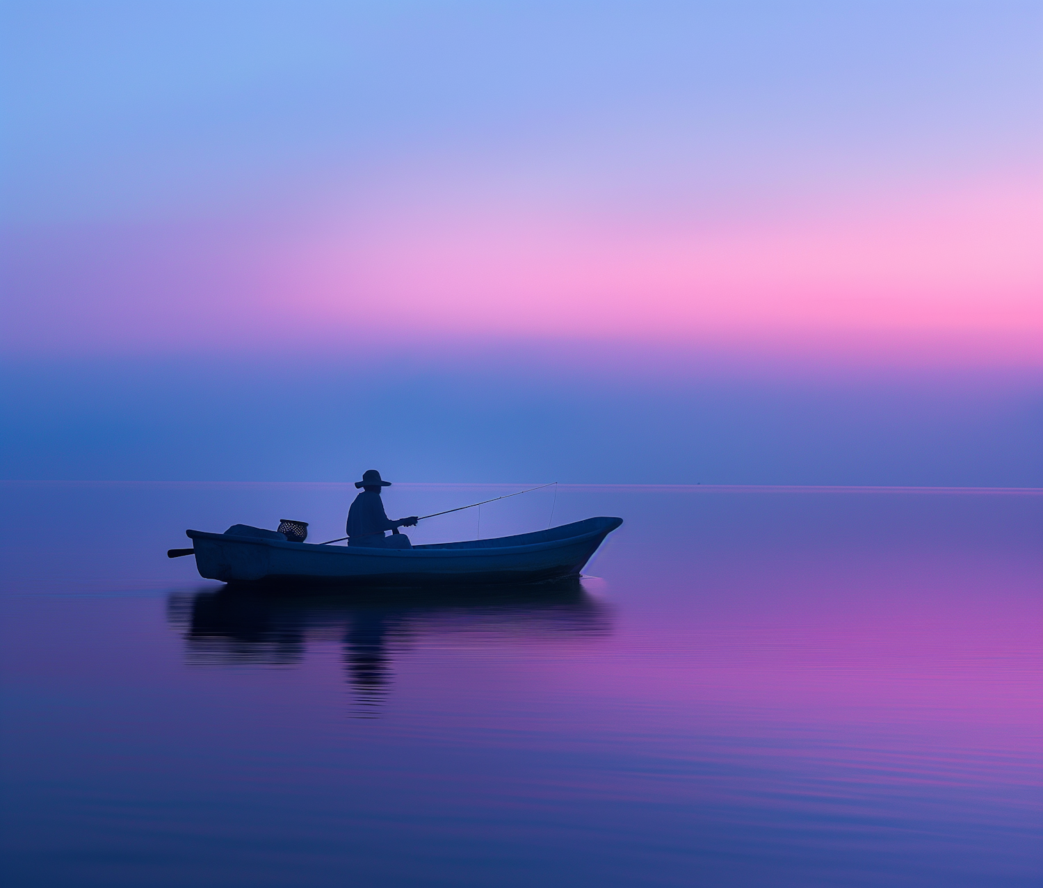 Serene silhouette of a fisherman in a boat at sunset, with pastel sky and water reflections creating a tranquil scene.