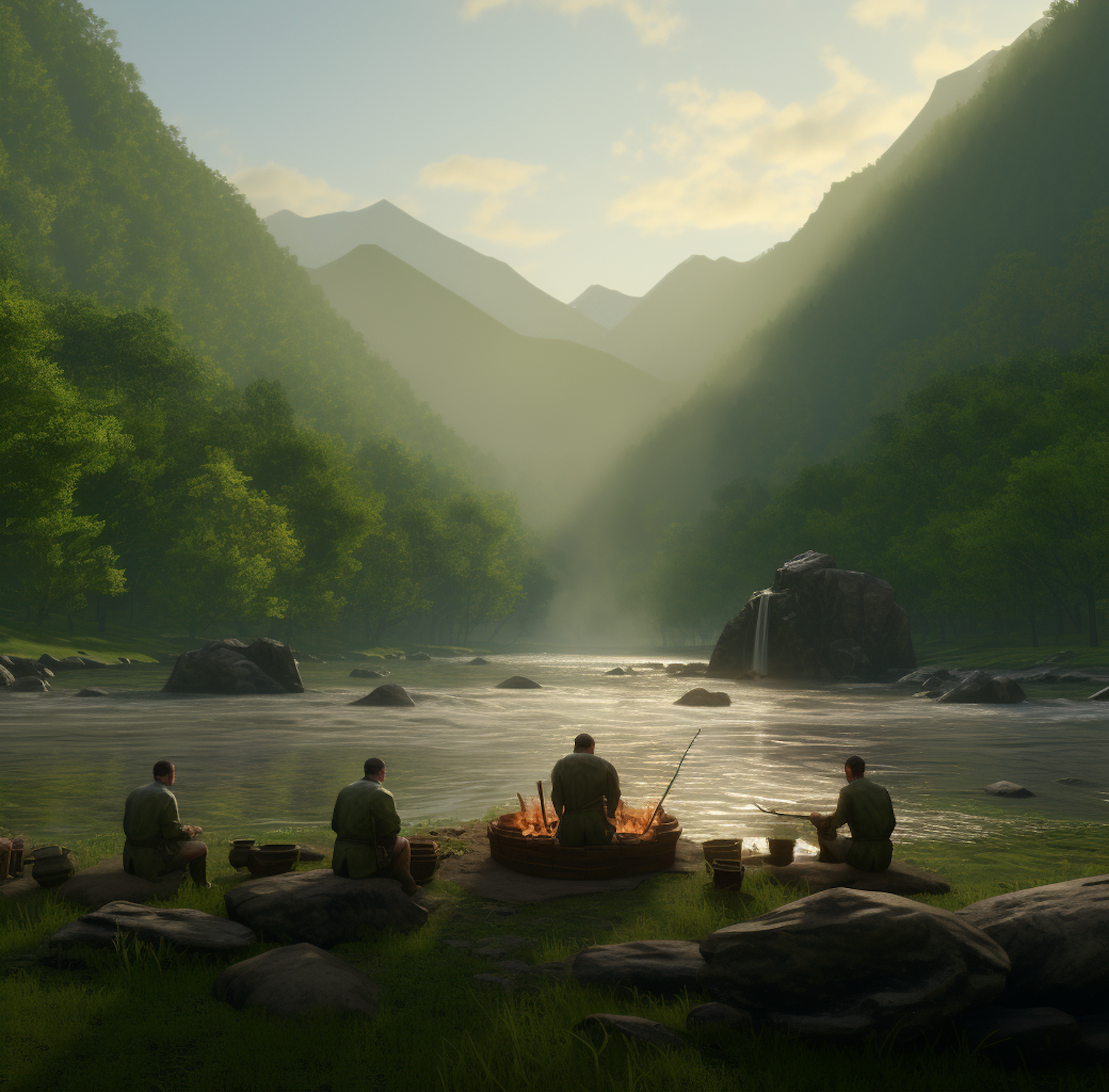 Four men sit by a river in a serene mountain landscape, surrounded by lush greenery and a gentle waterfall.