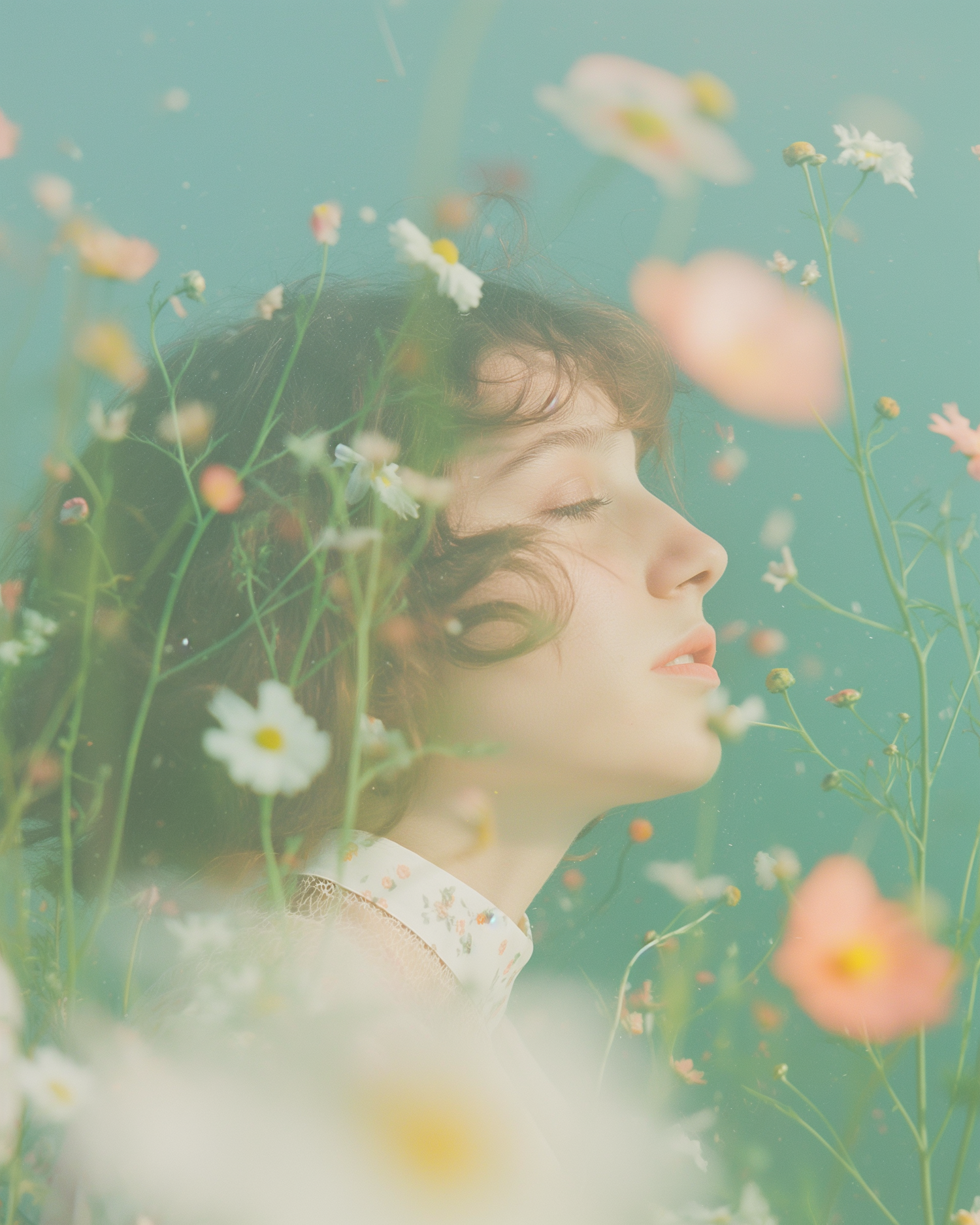 A serene portrait of a woman surrounded by soft-focus wildflowers, evoking tranquility and connection with nature.
