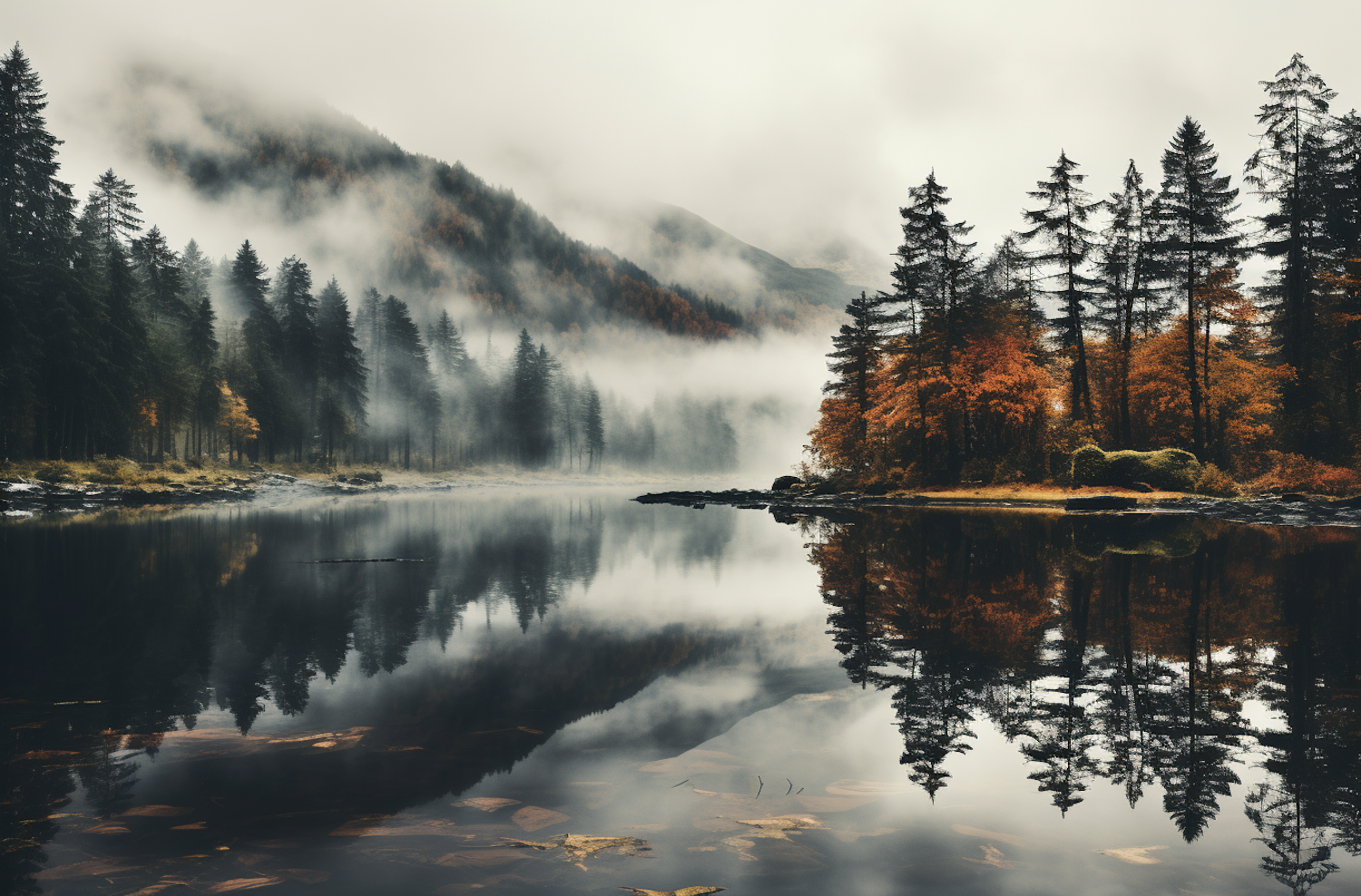 Misty forest reflected in a tranquil lake, with autumn colors and serene atmosphere. Perfect symmetry and soft, diffused light.