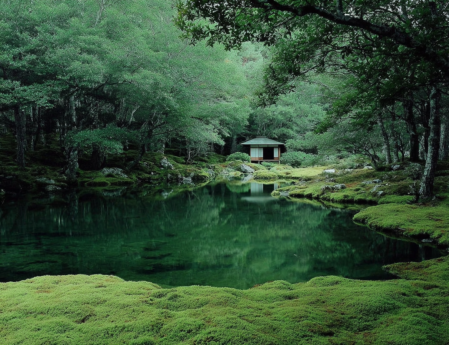 A tranquil forest scene with a Japanese-style house by a reflective pond, surrounded by lush greenery and moss-covered ground.
