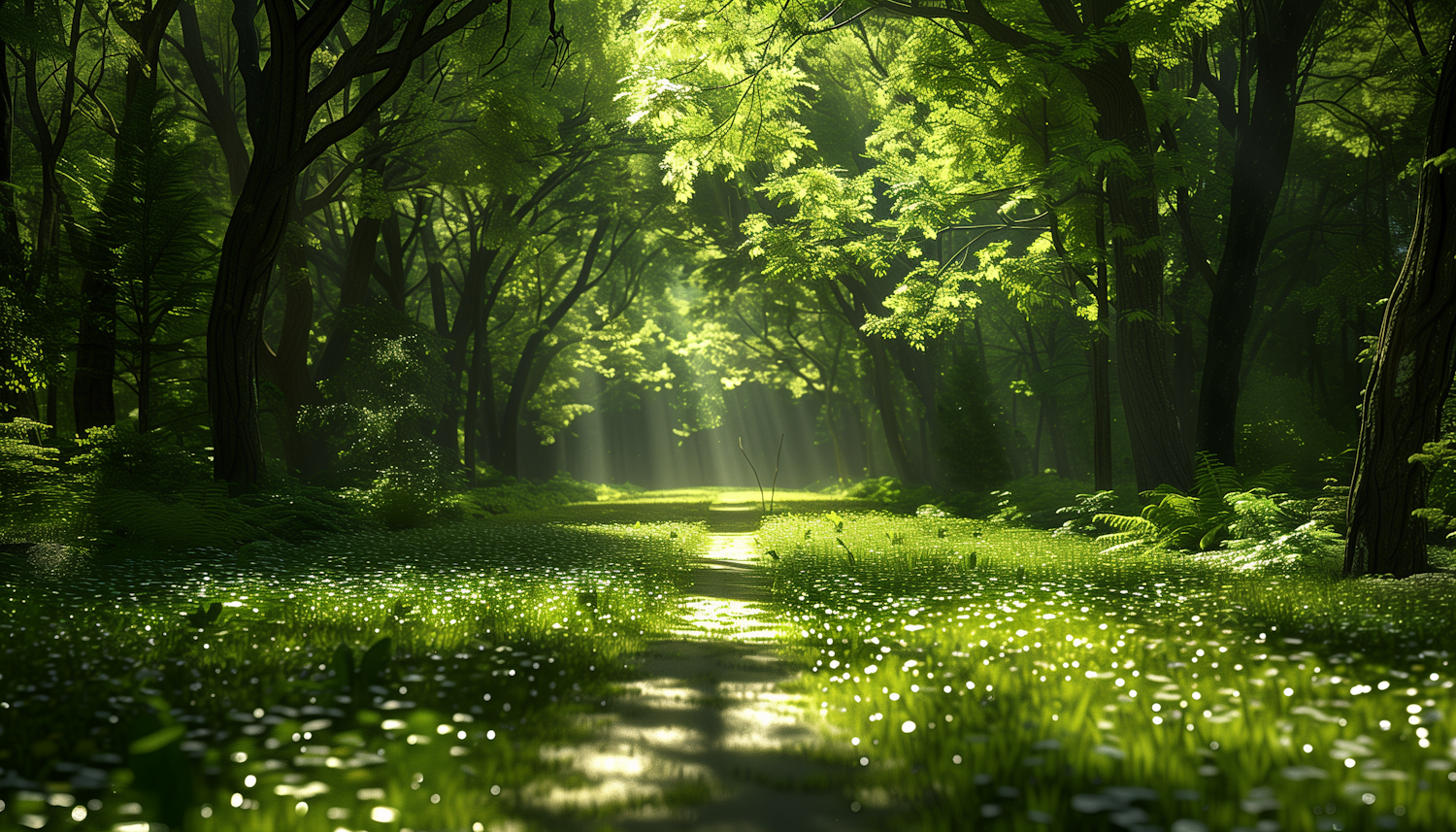 Serene forest path with sunlight filtering through lush green trees and a carpet of grass and flowers.