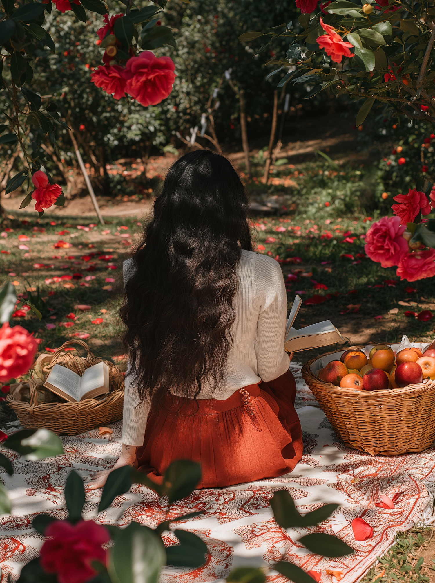 Woman reading in a garden surrounded by red flowers and apples, creating a serene and picturesque scene.