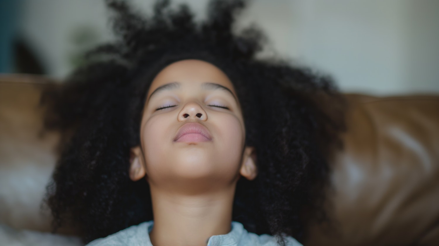 A young girl with curly hair relaxes with eyes closed, exuding calmness. Soft lighting and a blurred background enhance the serene mood.