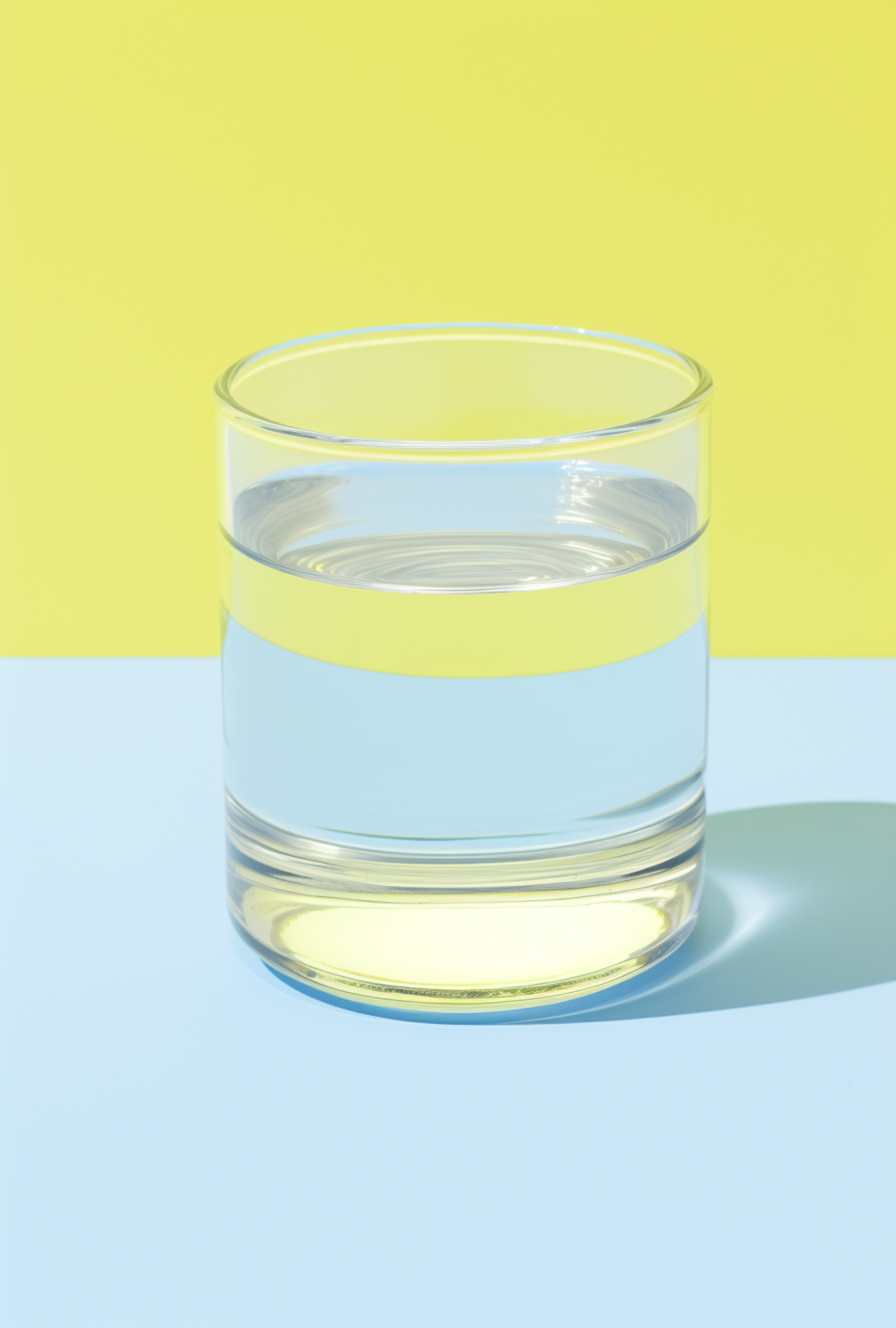 A clear glass of water on a vibrant yellow and blue background, creating a striking color contrast and reflection.