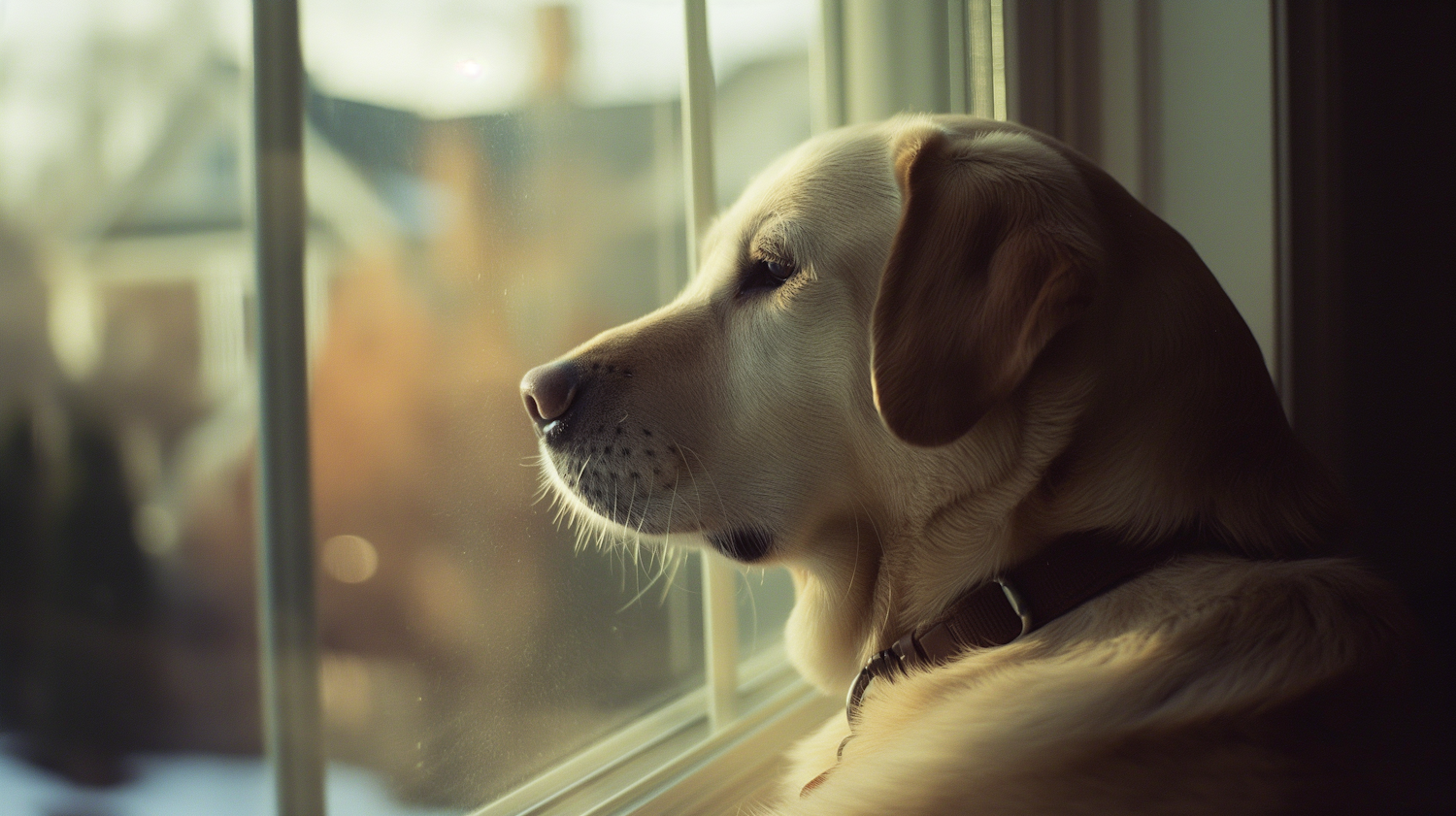 Golden Labrador Retriever gazing out a window, bathed in soft light, with a blurred suburban background.