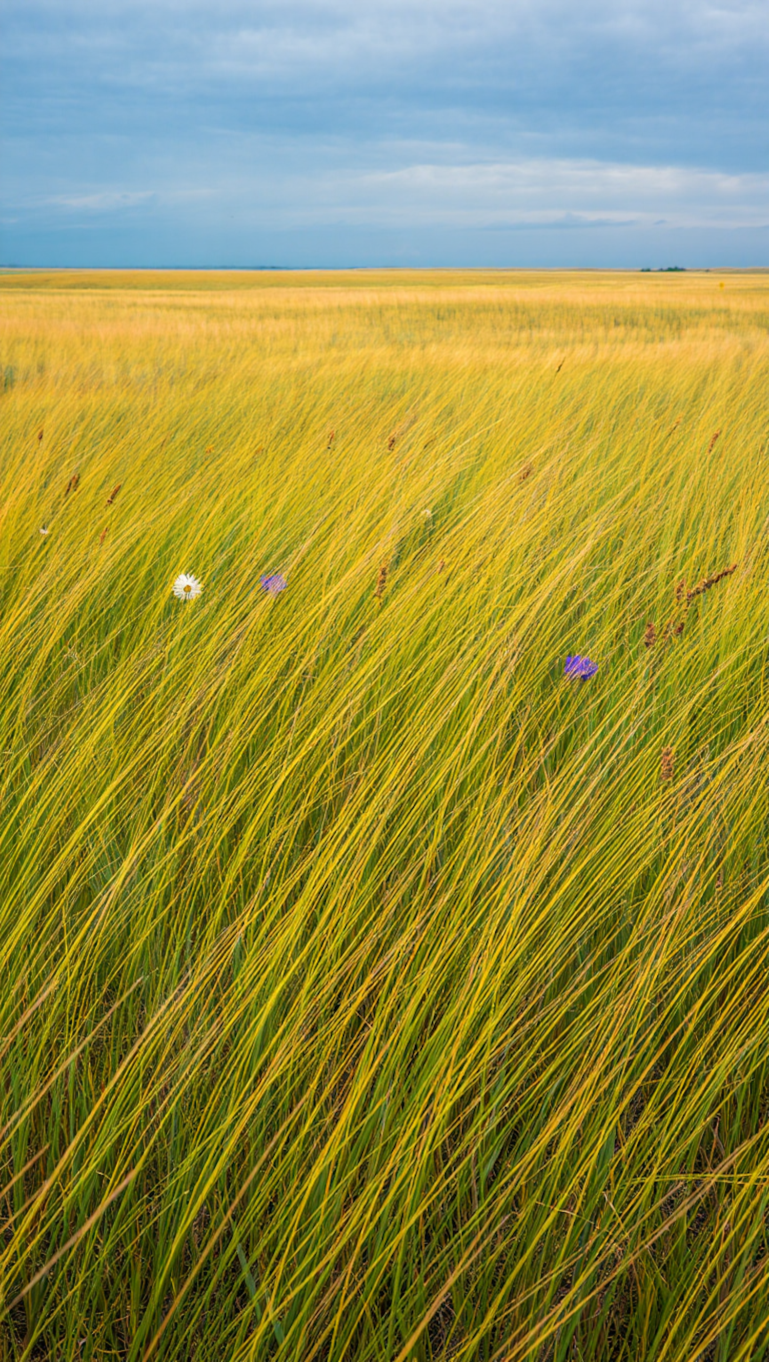 A tranquil expanse of tall green and yellow grass with scattered purple and white flowers under a softly clouded blue sky.