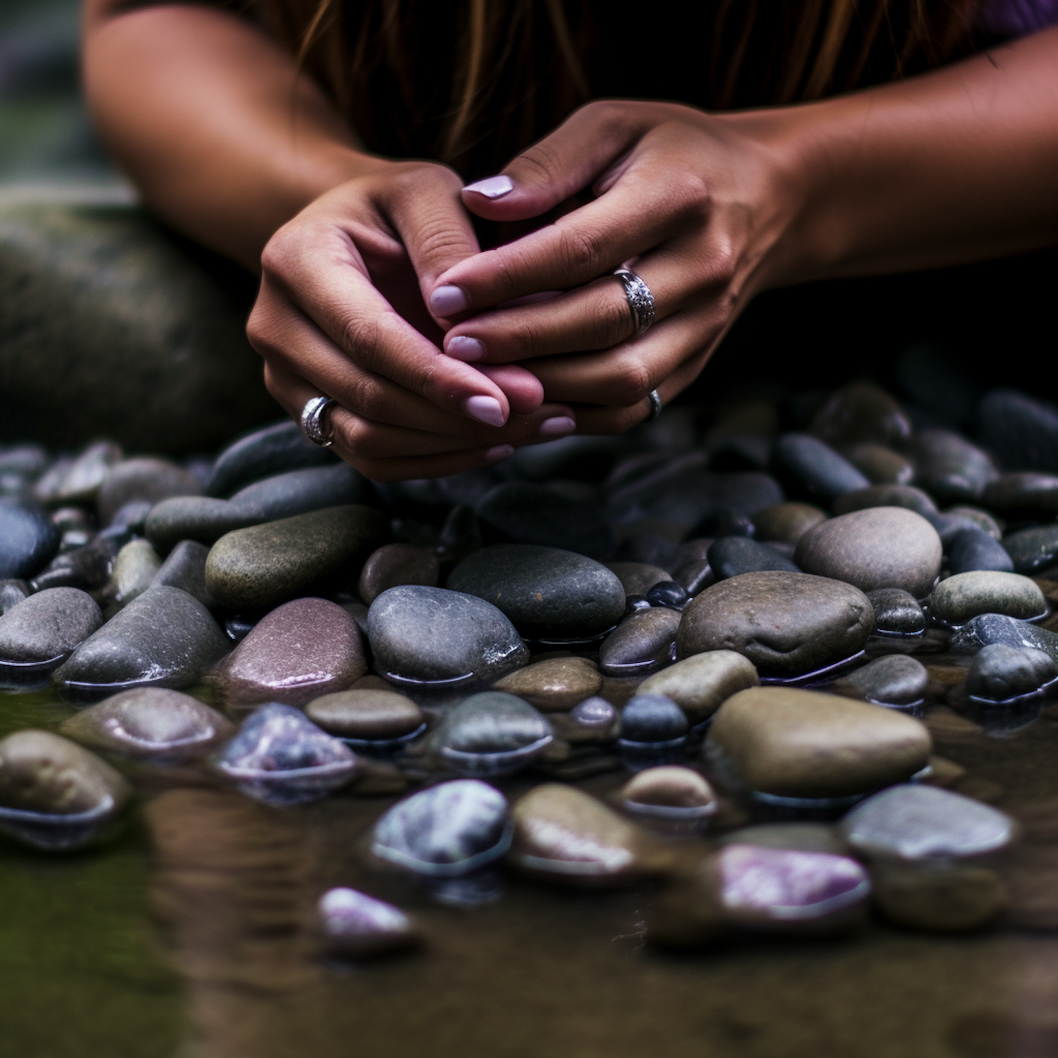 Hands with silver rings rest on smooth, wet stones in shallow water, creating a serene and tactile scene.