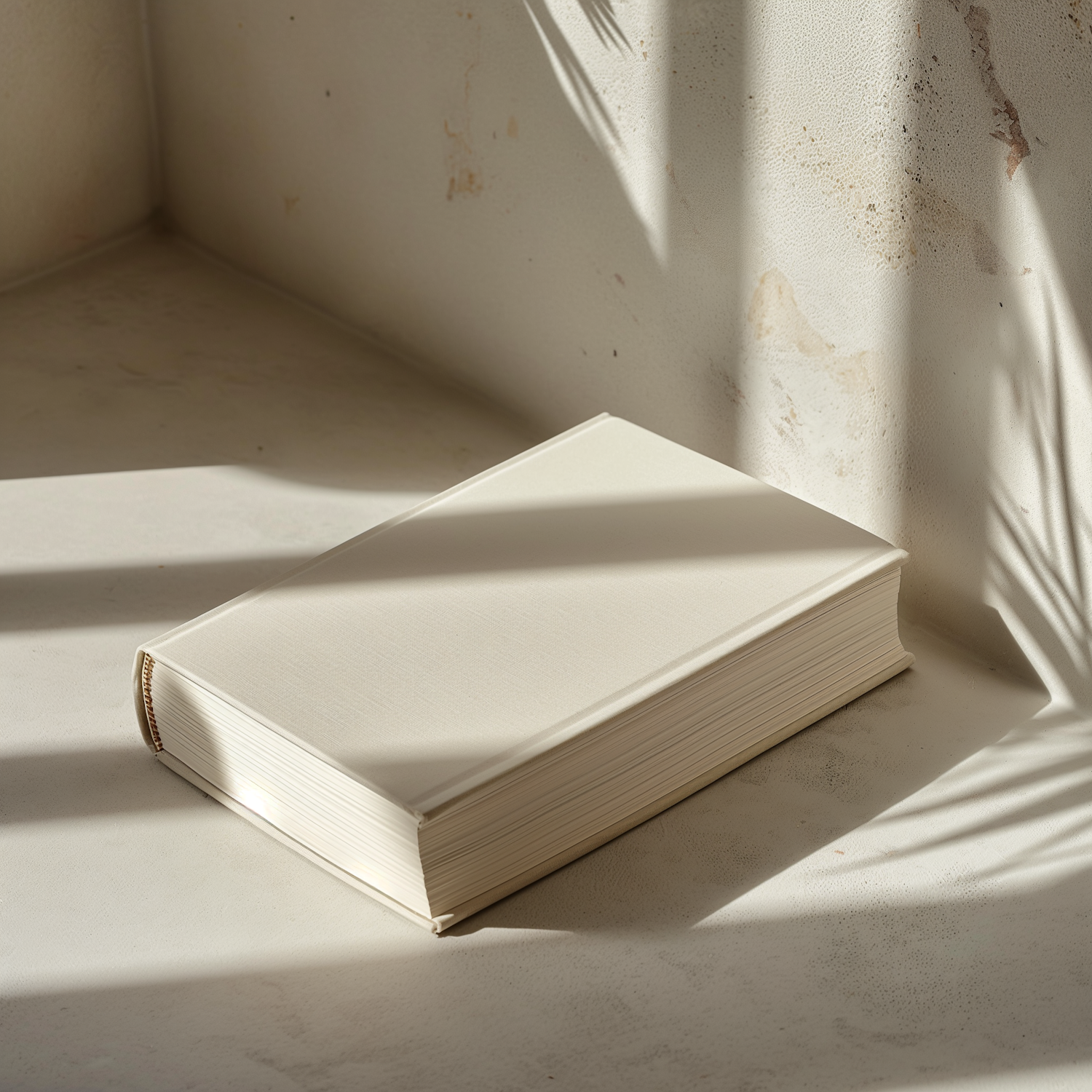 Minimalist scene with a closed book in warm sunlight, casting soft shadows on a textured surface. Neutral tones create a serene atmosphere.