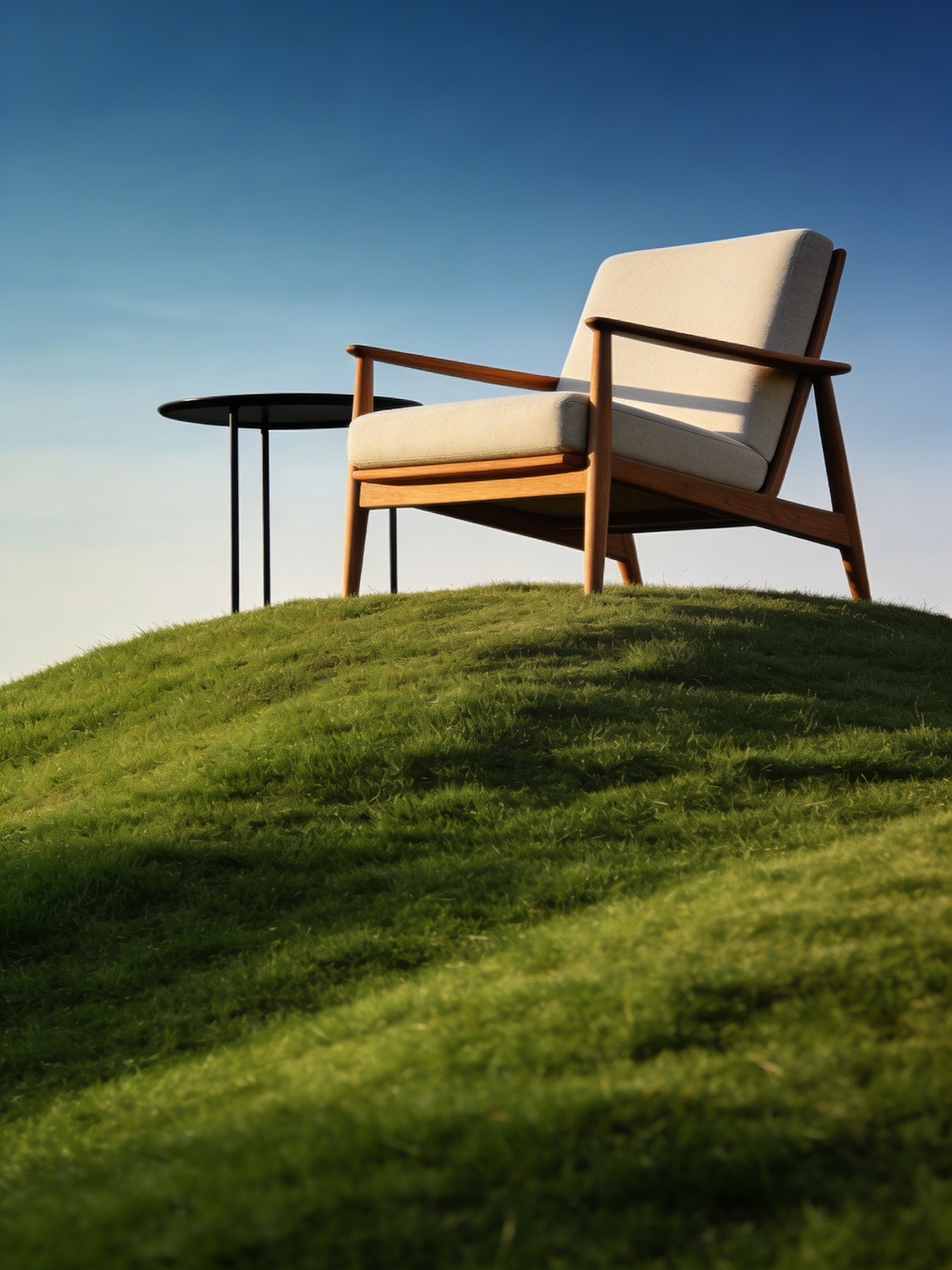 A wooden armchair with beige cushions sits on a grassy hill under a clear blue sky, accompanied by a small black table.