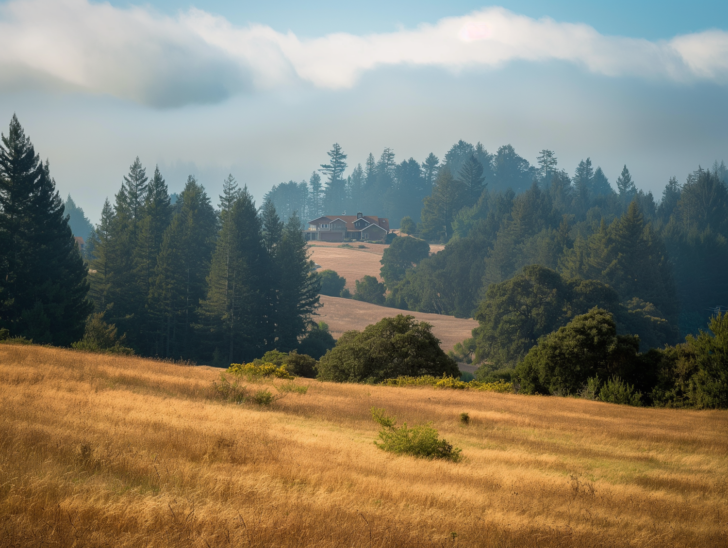 Tranquil landscape with golden fields, evergreen forest, and a distant house under a misty sky.