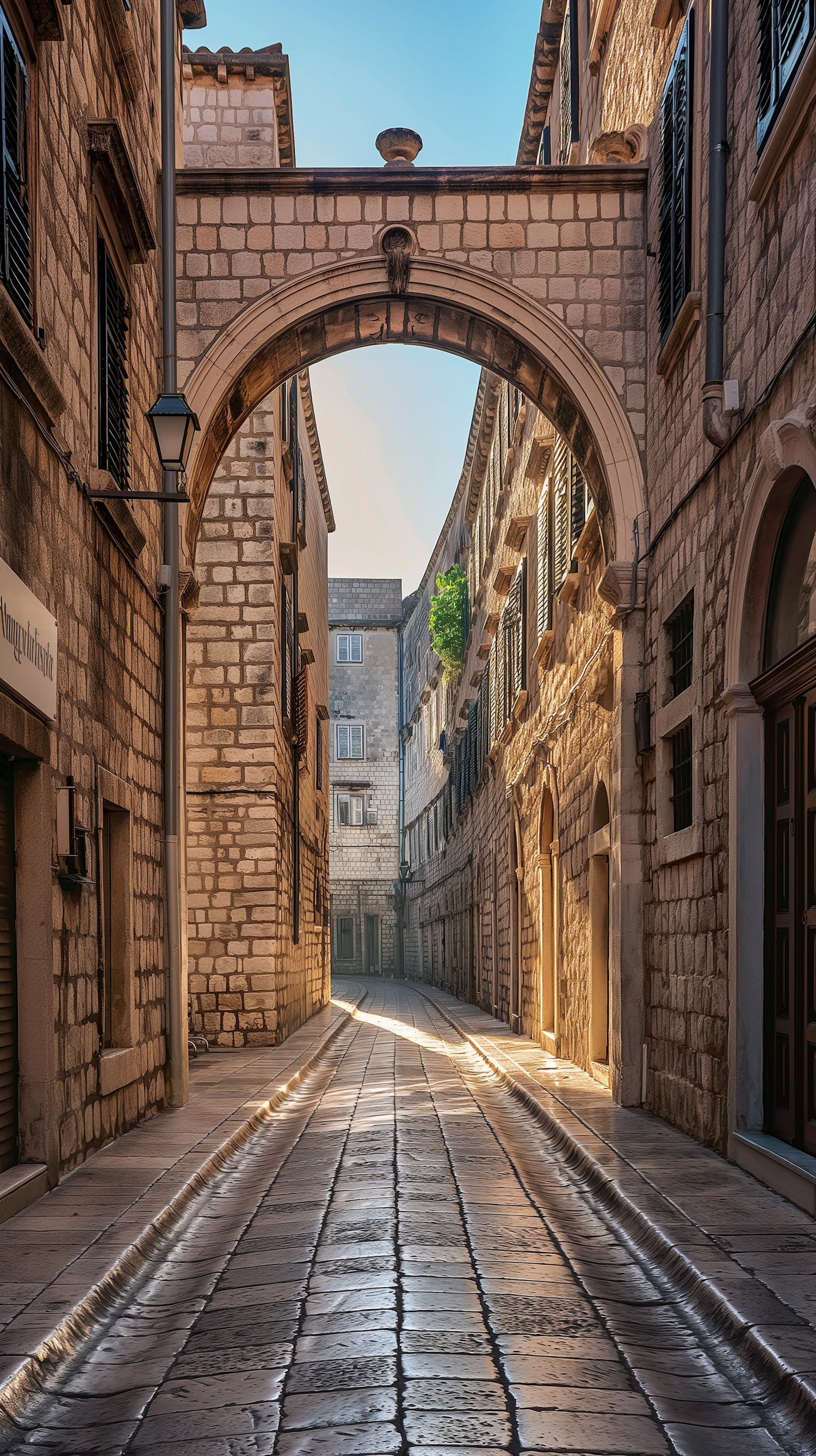 Charming narrow street with cobblestone path and stone archway, bathed in golden sunlight, in a historic European town.