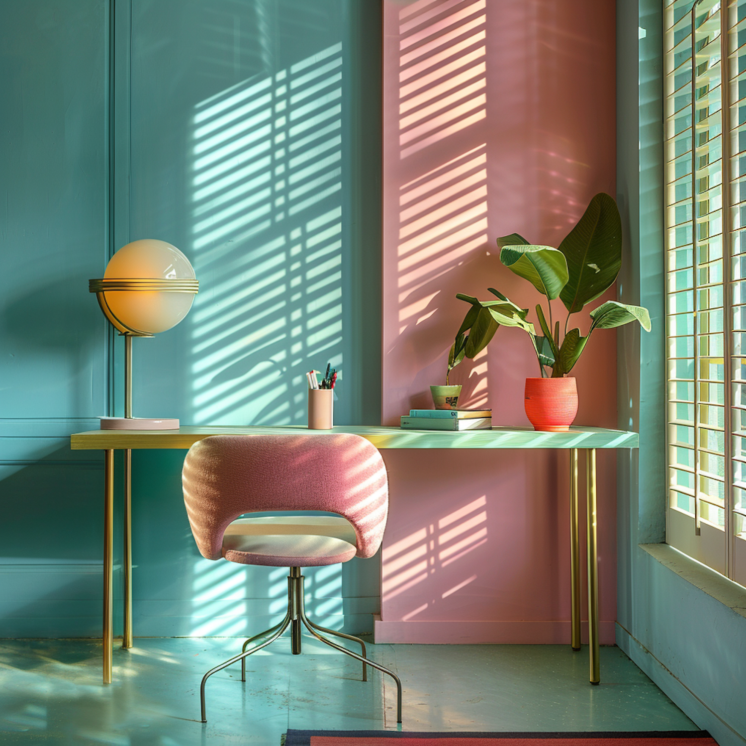 Modern workspace with pastel colors, featuring a pink chair, teal and pink walls, a desk with a lamp, and a potted plant.