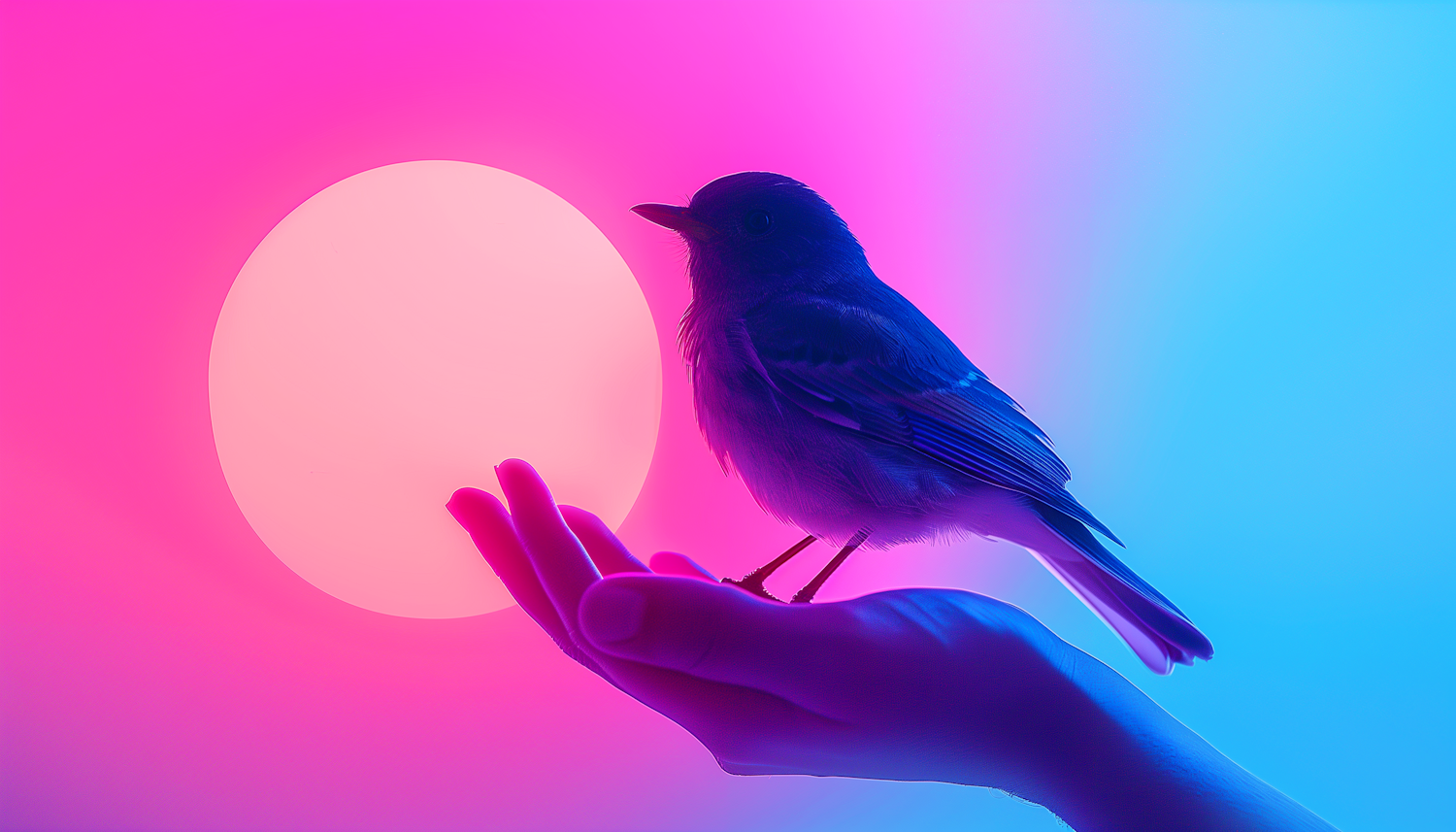 A bird perched on a hand against a vibrant pink and blue neon background, creating a surreal and ethereal atmosphere.