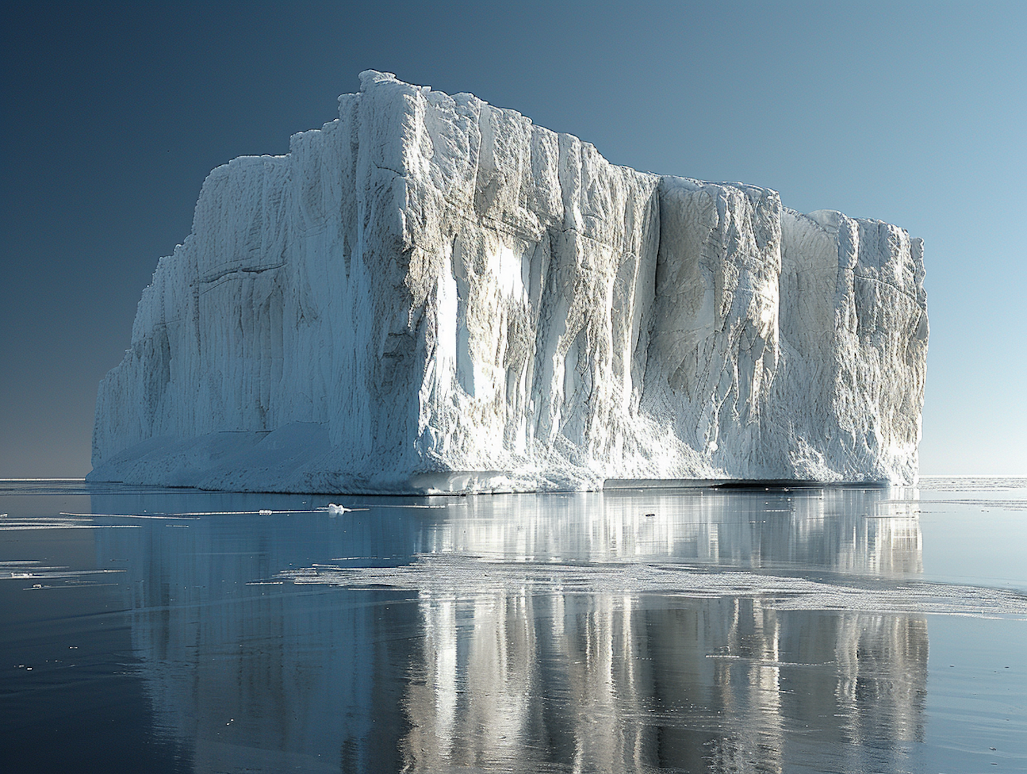 Majestic iceberg reflecting in calm waters under a clear blue sky, showcasing nature's serene beauty and grandeur.