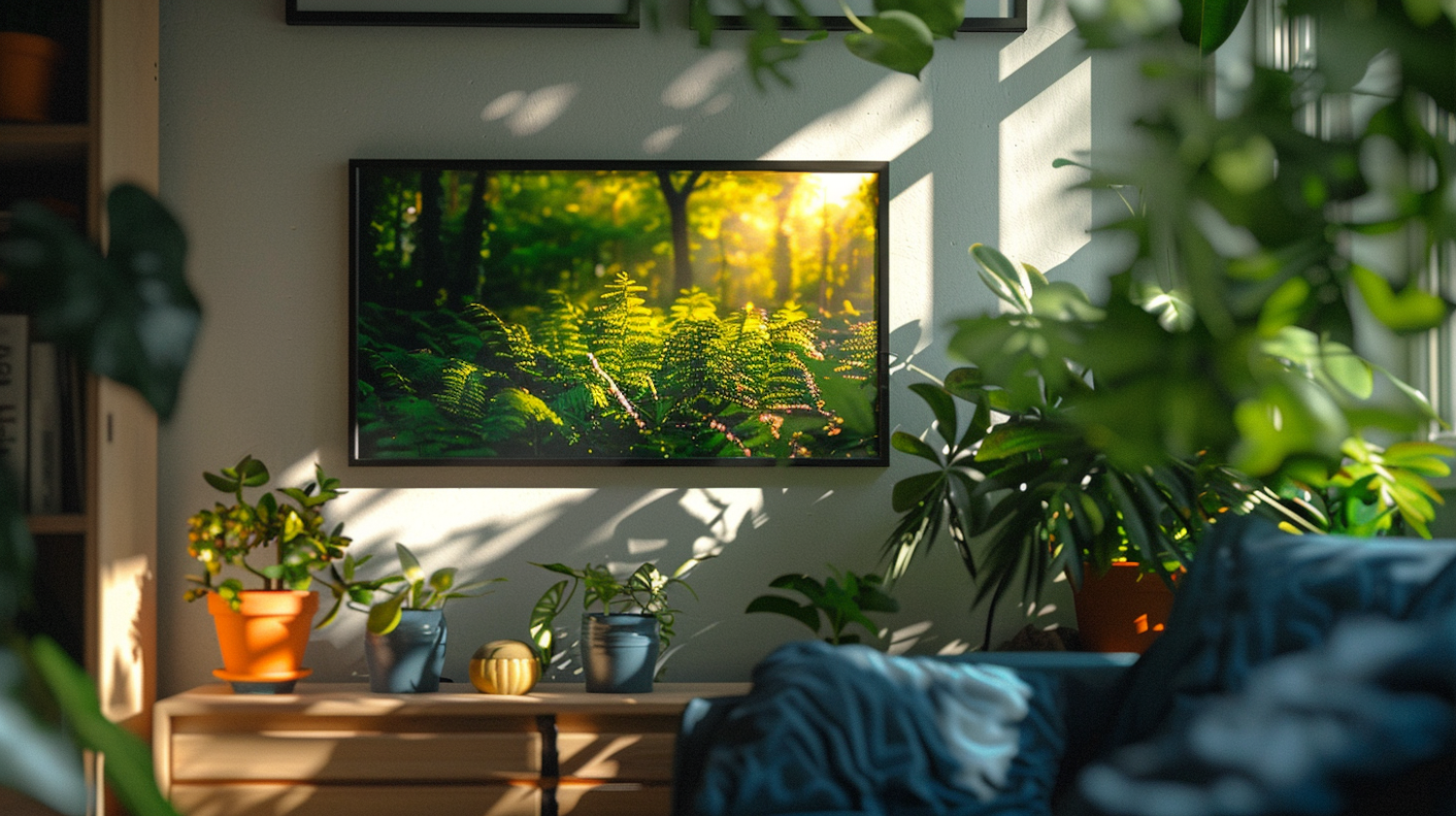 Sunlit living room with lush plant decor and a vibrant forest photo, creating a serene and inviting atmosphere.
