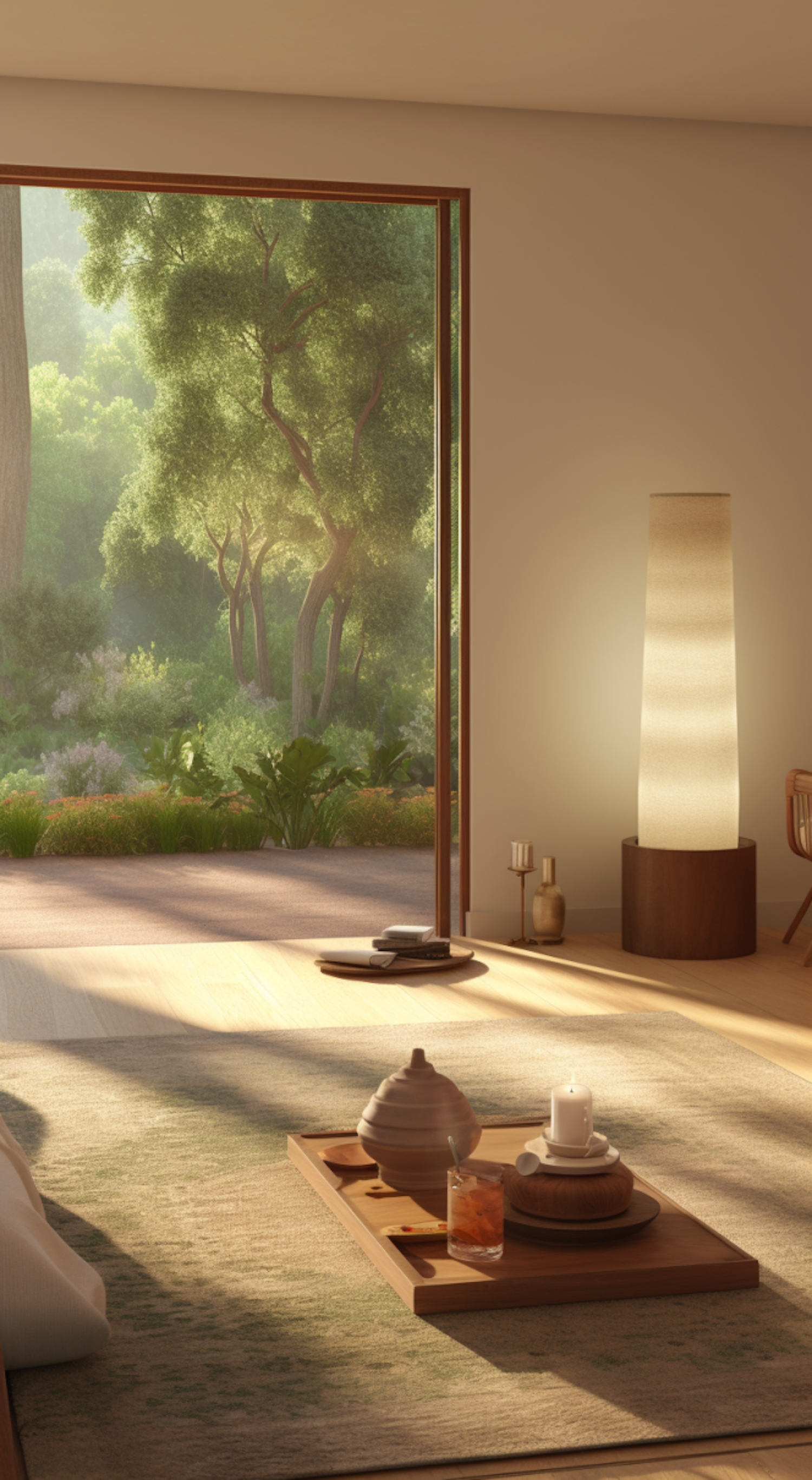 Minimalist room with open doorway to lush garden, featuring a wooden tray with tea set and candle, and a tall elegant lamp.