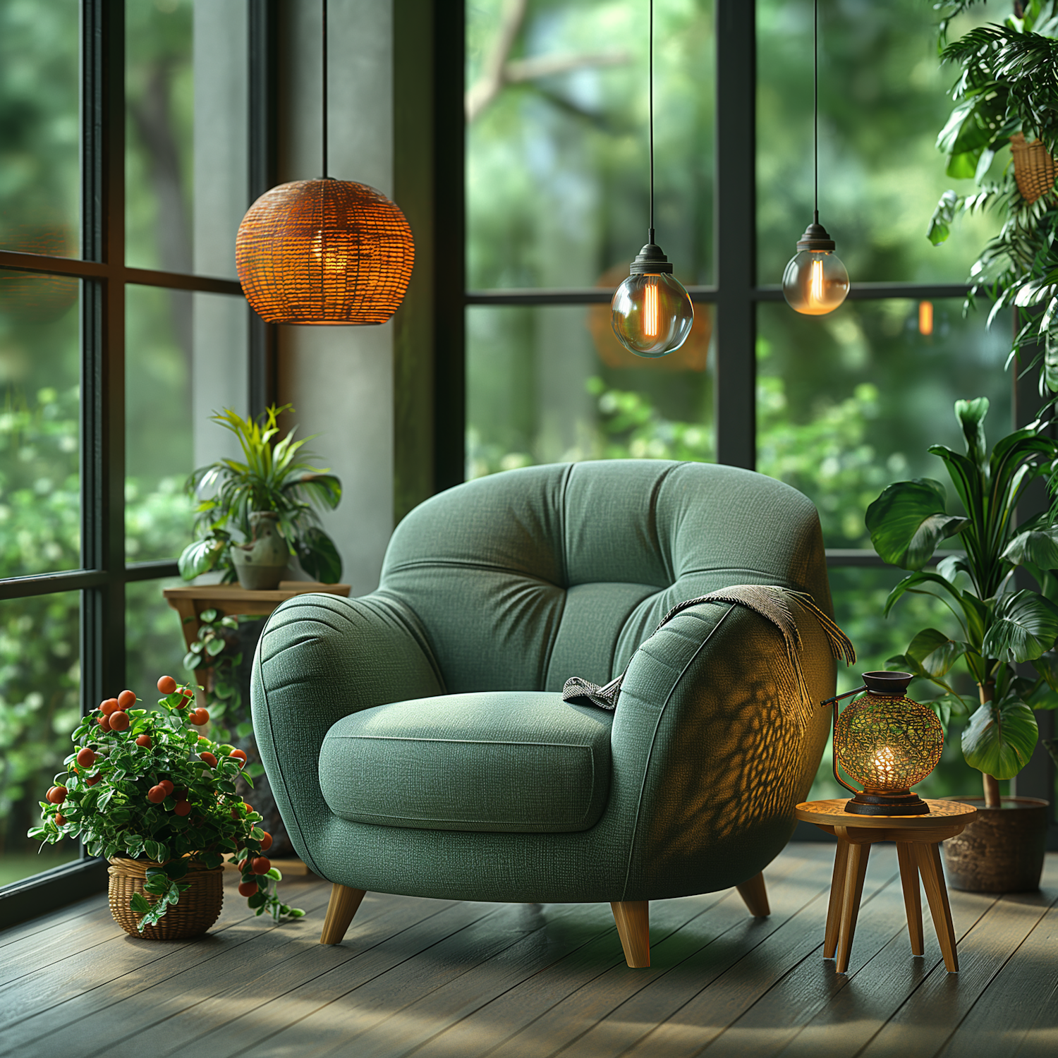 Cozy living room with a green armchair, pendant lights, and lush plants by large windows, creating a serene ambiance.