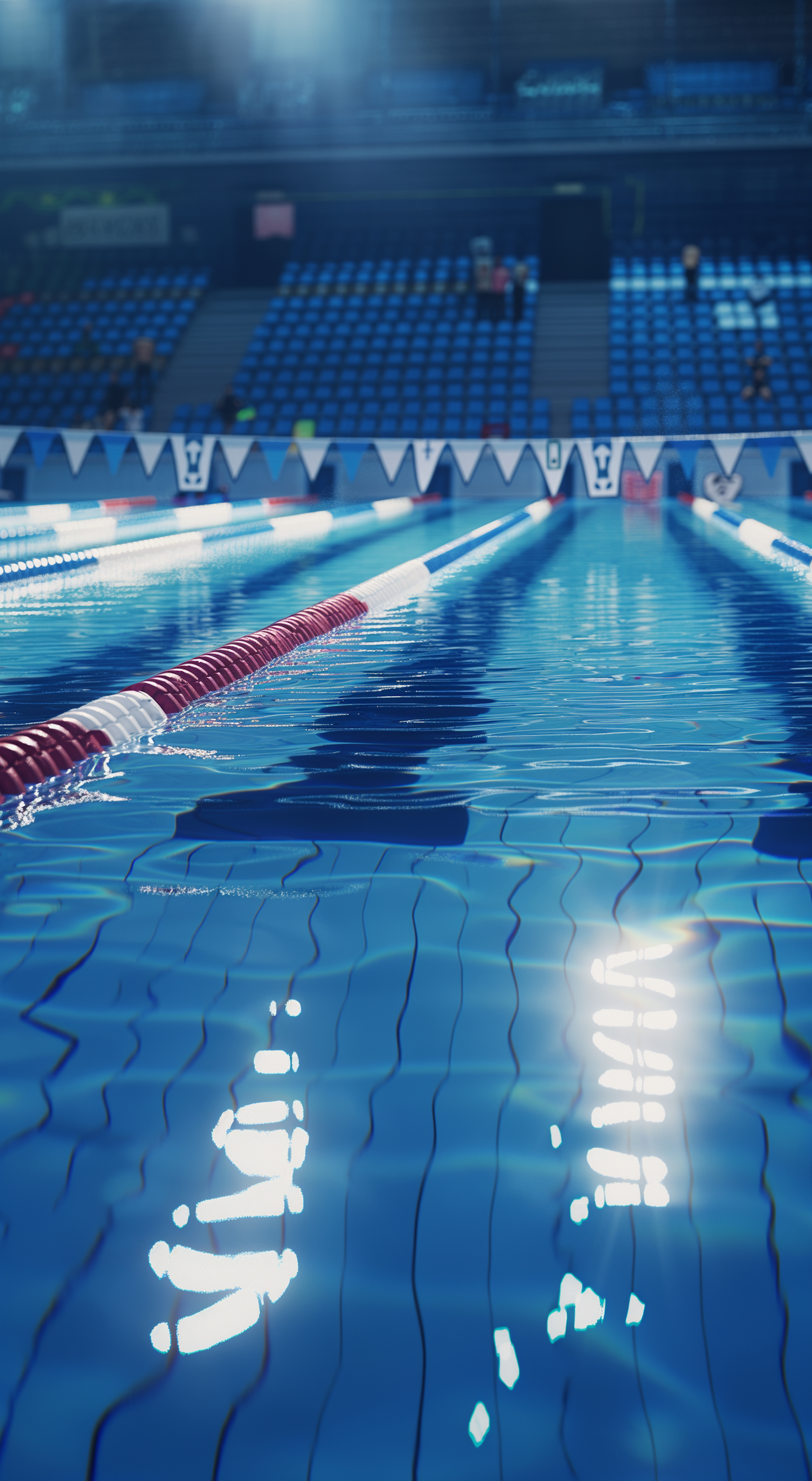 Serene indoor swimming pool with clear blue water, lane dividers, and empty seats, capturing a calm and structured atmosphere.