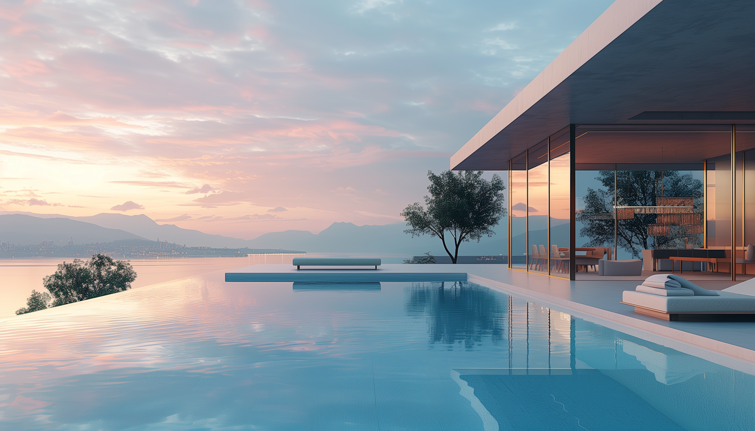 Luxurious modern house with infinity pool, glass walls, and stunning sunset view over a lake and mountains.