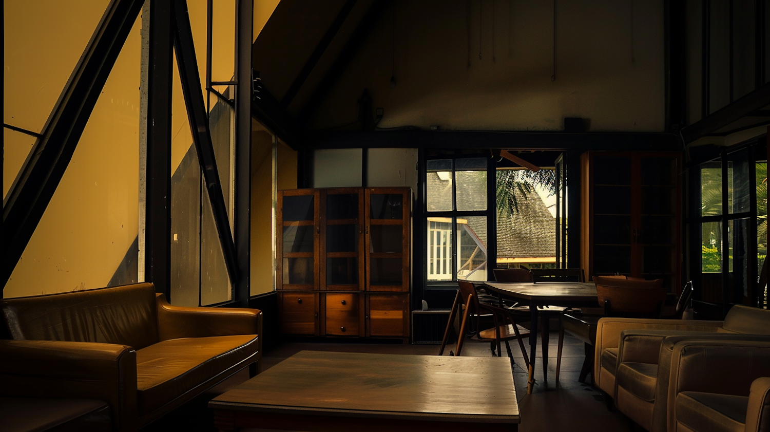 Cozy room with modern and rustic furniture, large glass panels, and warm lighting. Features a leather sofa, wooden chairs, and a cabinet.