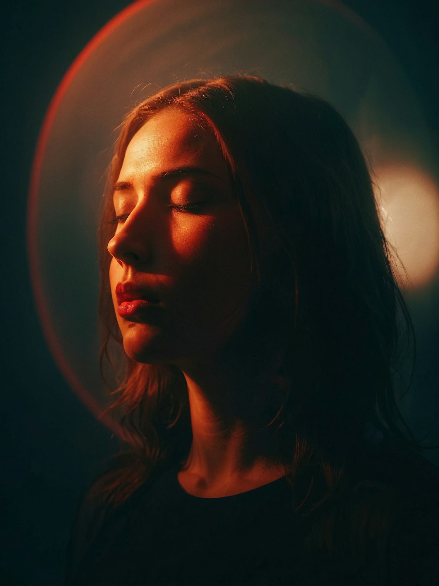 A serene portrait of a woman with closed eyes, bathed in warm, dramatic lighting, creating a peaceful and introspective mood.