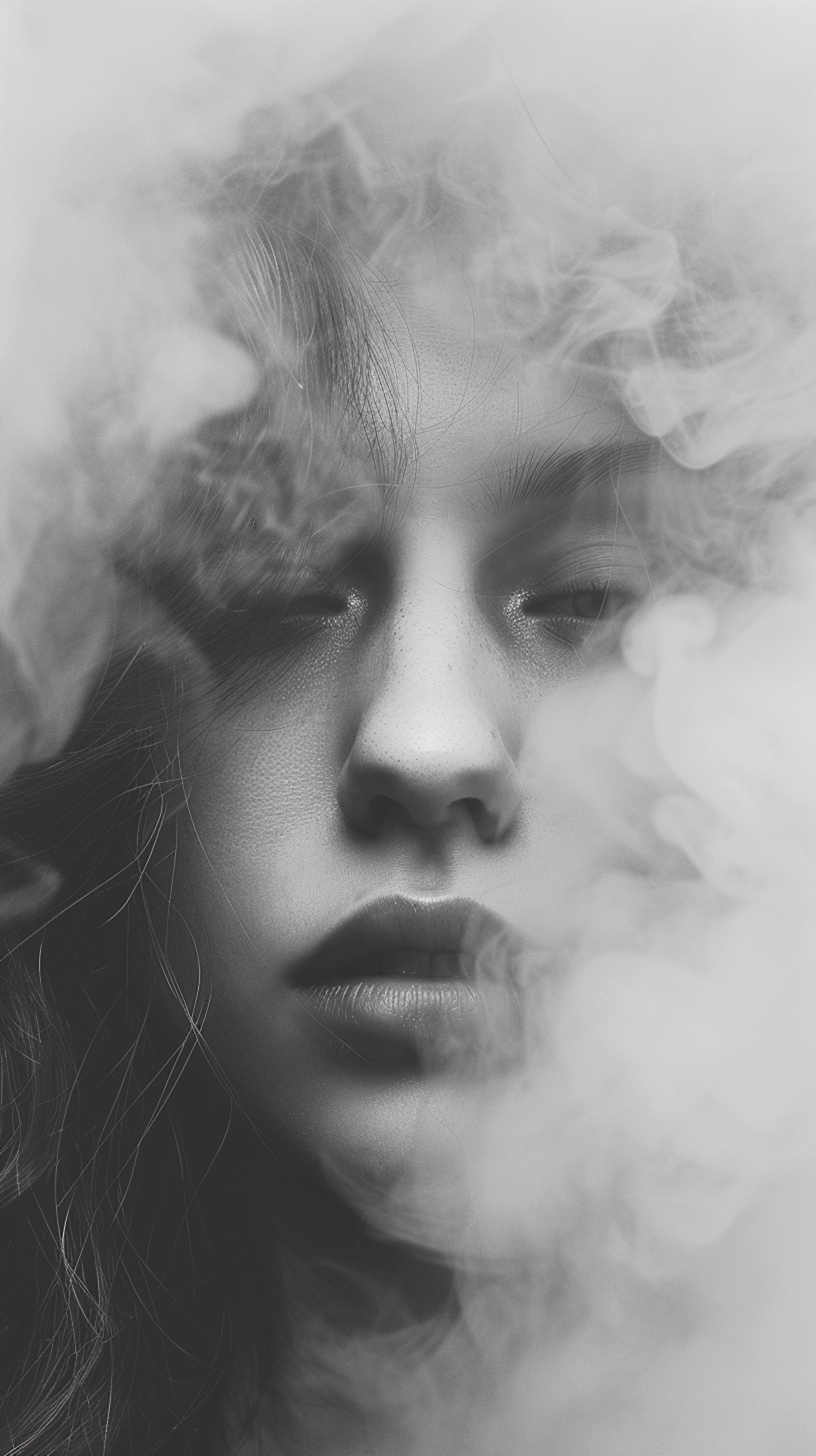 Ethereal black and white portrait of a young woman enveloped in swirling smoke, creating a mysterious and dreamlike atmosphere.