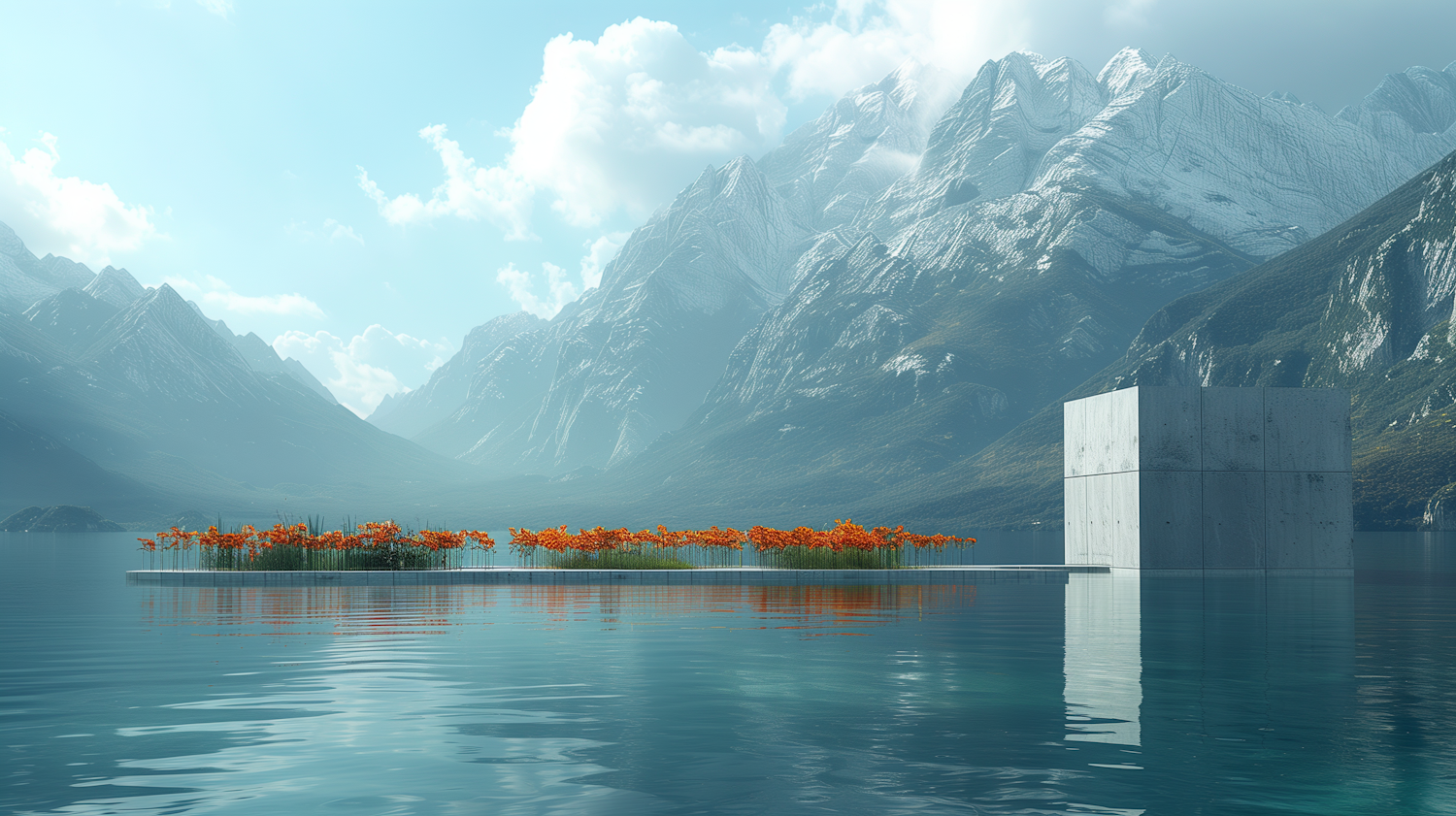 Serene landscape with a concrete cube, orange flowers, and snow-capped mountains reflecting in calm water.