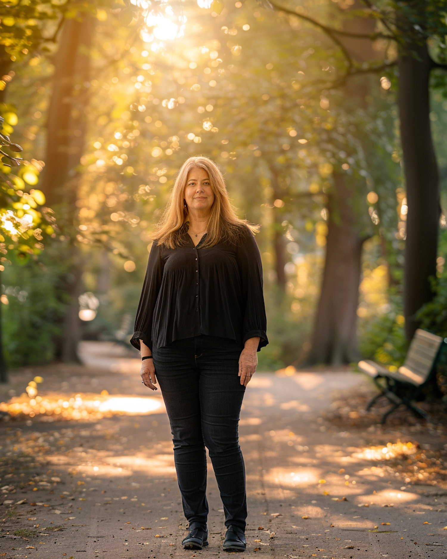 Caucasian woman in black attire stands on a sunlit park path, surrounded by trees and warm golden light.