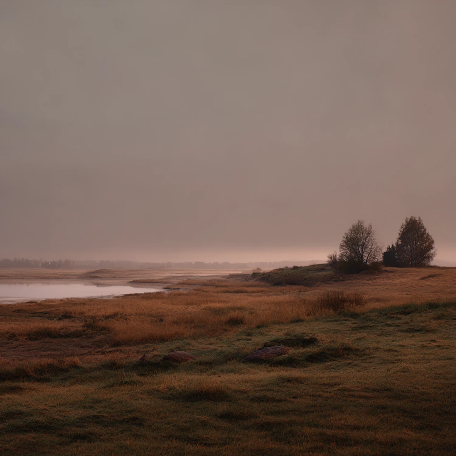 A tranquil landscape with grassy fields, a calm water body, and distant trees under a soft, overcast sky.