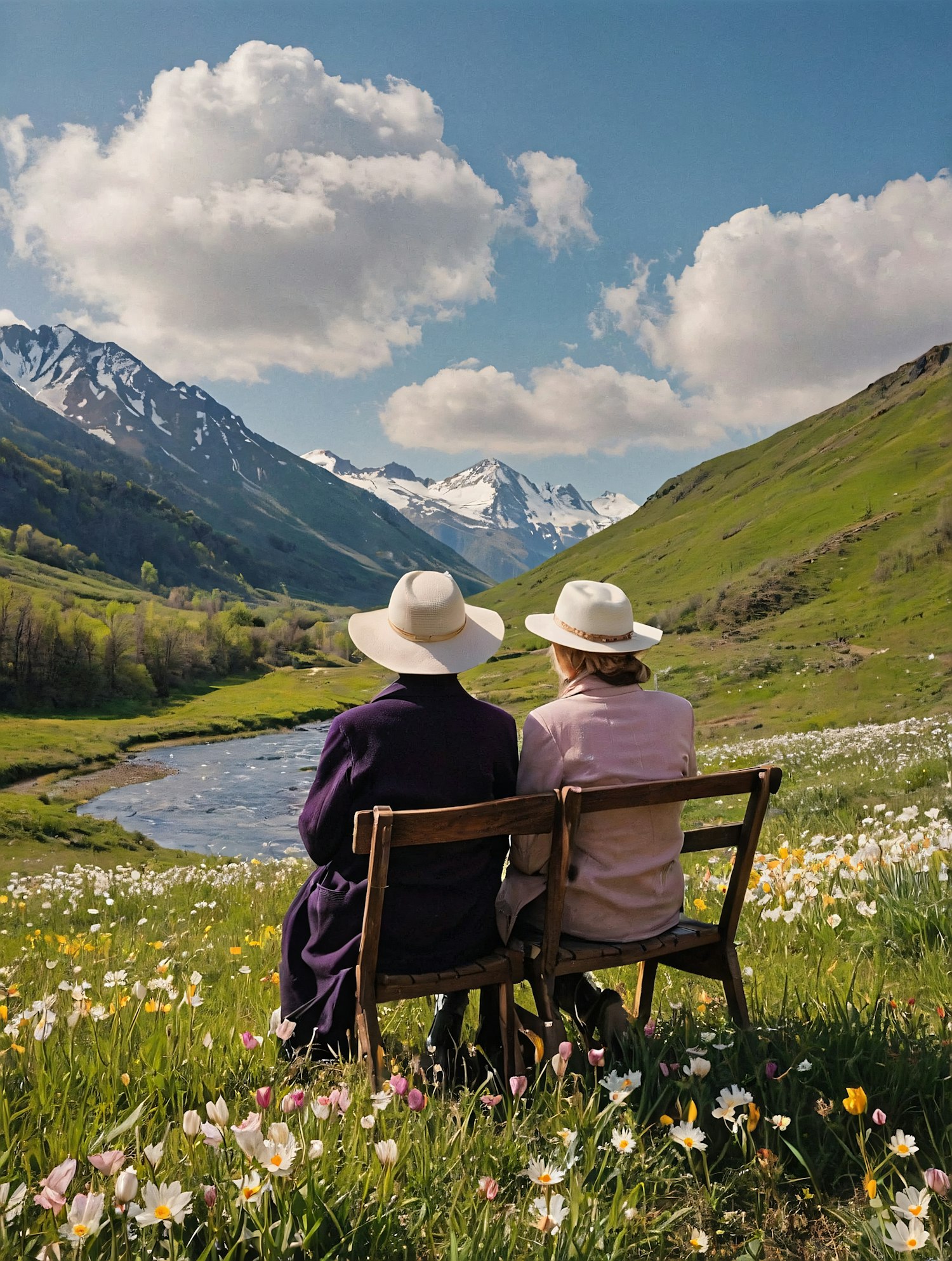 Two people in hats sit in a flower-filled meadow, overlooking mountains and a river under a blue sky with clouds.