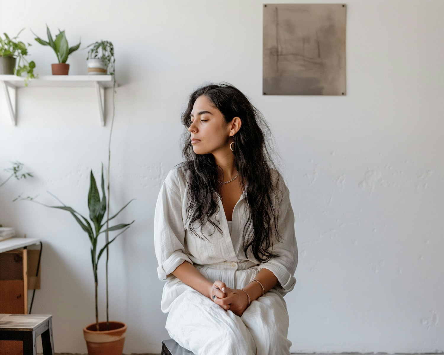 Woman in white outfit sitting in a minimalist room with plants and abstract art, exuding calm and contemplation.